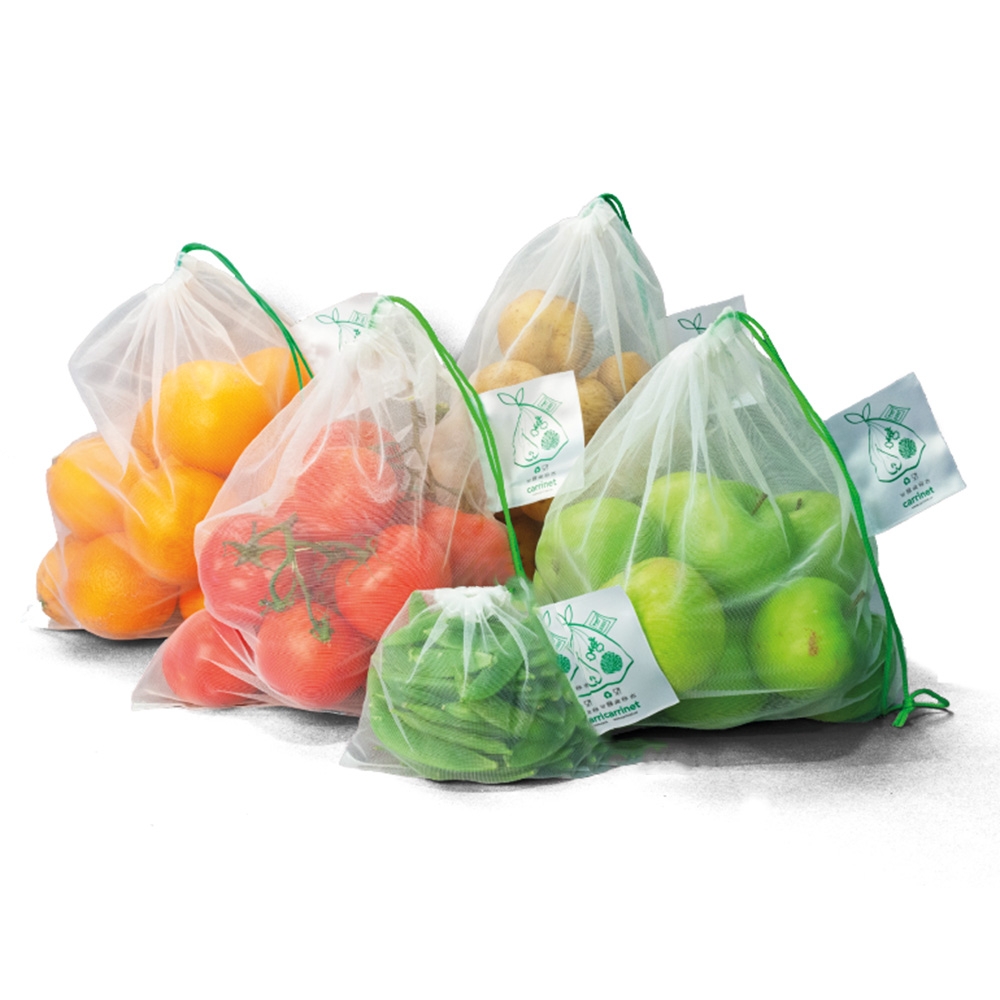 Daugkartinis maišelis vaisiams ir daržovėms, 4 vnt. Rinkinį sudaro 4 vnt. vienodo dydžio maišeliai. Maišelio matmenys: 32x39cm Pagaminta iš 100% rPET medžiagos, t.y. iš audinio pagaminto iš perdirbtų plastikinių butelių gėrimams. Maišelis užsitraukia žalia virvele. Galima skalbti skalbimo mašinoje 30°C temperatūroje. Galima naudoti kaip skalbimo maišelį apatiniam trikotažui arba kojinėms.