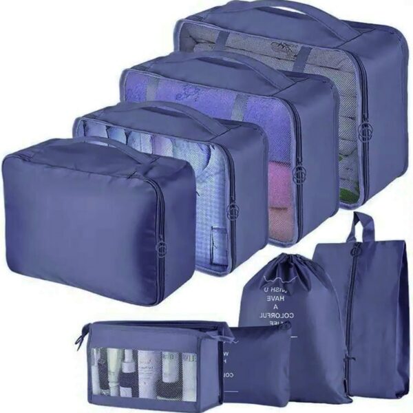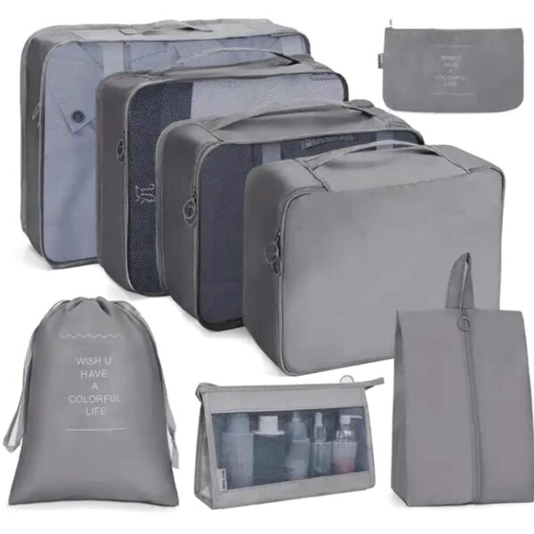 Patogus kelioninis krepšys, susidedantis iš net 8 elementų – 3 paketėlių, 3 maišelių, kosmetinės ir maišelio. Visi jie užsegami užtrauktuku (išskyrus maišelį) ir turi daug skyrių bei kišenių! Tai puikus būdas sutvarkyti kasdienę kosmetiką! Jie taip pat puikiai tinka kelionėms, nesunkiai susidedant visą svarbiausią kosmetiką ir kitus smulkius aksesuarus, tokius kaip lūpų dažai, pudra, pagaliukai…