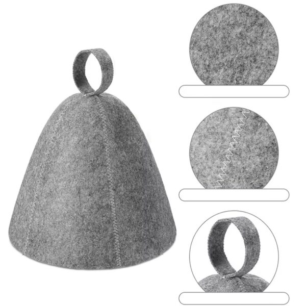 Apsauginė kepurė saunai iš veltinio. Efektyviai apsaugo galvos odą ir plaukus nuo aukštos temperatūros ir drėgmės. Prekės savybės: Ji pagaminta iš patvarios medžiagos, kuri puikiai izoliuoja ir greitai džiūsta. Papildomas kabliukas viršuje leidžia patogiai pakabinti. Specifikacija: Medžiaga: poliesterio audinys + vilna (veltinis) Aukštis: 23 cm Apimtis: 70 cm Storis: 3 mm Pilka spalva Plastikinė pakuotė