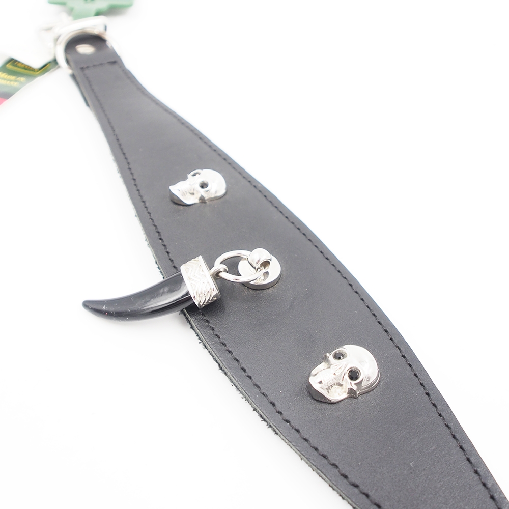 HUNTER odinis šuns antkaklis 37 cm, juodas su kaukolių ir ilties dekoru Išskirtinio dizaino HUNTER odinis antkaklis – tai unikalus aksesuaras, skirtas drąsiems ir stilingiems šunims. 37 cm ilgio, juodos spalvos natūralios odos modelis dekoruotas metalinėmis kaukolėmis ir kabančiu ilties formos pakabuku. Antkaklis pagamintas Vokietijoje, naudojant Swarovski kristalų elementus. Savybės: Dydis: 37 cm – tinka…