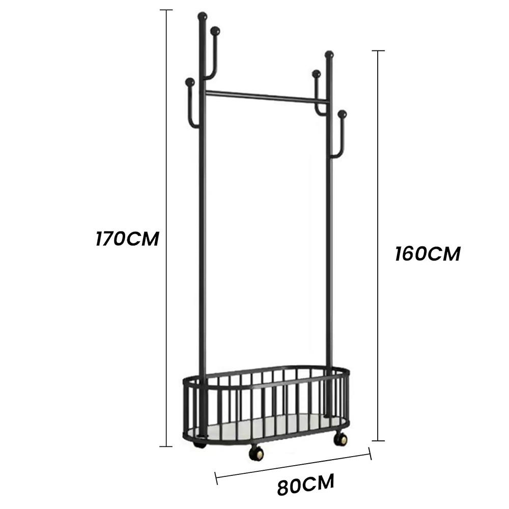 Drabužių kabykla su ratukais ir lentyna (80x40x170 cm) Ši modernaus dizaino drabužių kabykla yra ne tik stilinga, bet ir ypač funkcionali – puikiai tinka prieškambariui, miegamajam ar persirengimo kambariui. Tvirta metalinė konstrukcija su kokybišku milteliniu padengimu užtikrina atsparumą rūdims ir ilgaamžiškumą, net jei kabinsite sunkius paltus ar žiemines striukes. Kabykla turi: 4 kablius šonuose skrybėlėms,…