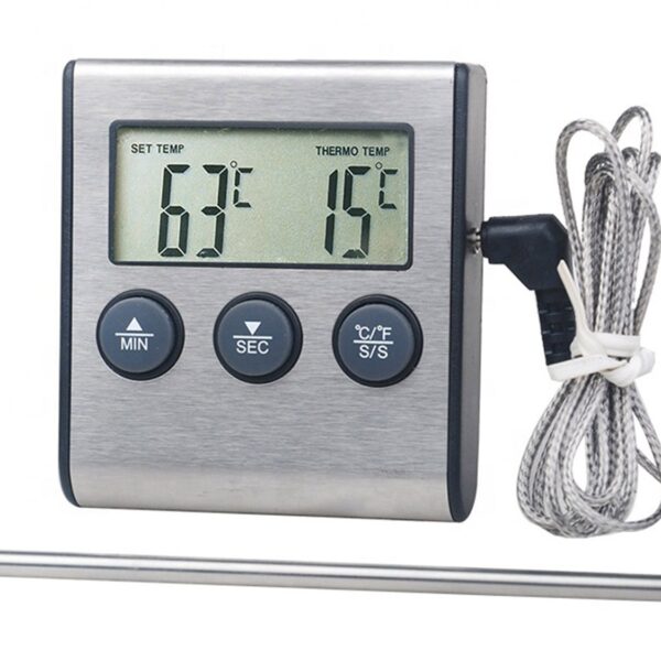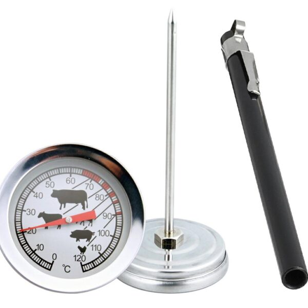 Elektroninis termometras su karščiui atspariu zondu. Puikiai tinka temperatūrai matuoti ant grotelių, rūkykloje ir dujinėse bei elektrinėse orkaitėse. Būtinas, kai viryklėje nėra įmontuoto temperatūros indikatoriaus. Prietaisas turi aiškų LCD ekraną, kuris palengvina matavimų skaitymą. Ilgas laidas ir karščiui atsparus smaigalio formos zondas leidžia lengvai įdėti jį net į maistą ir išmatuoti mėsos temperatūrą. Termometras taip…