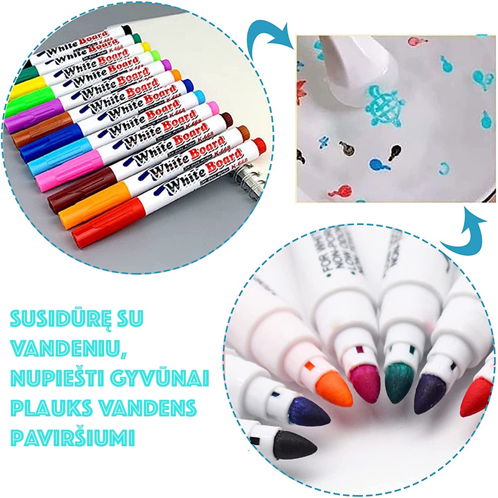 Dėmesio prekė brokuota! keli flomasteriai iš rinkinio sudžiūvę. Plaukiojantis flomasteriai Vandens pagrindo rašalas lengvai nuvalomas šluoste, nepaliekant jokių pėdsakų. Vandens pagrindu pagamintas rašalas netirpus vandenyje, o nupiešti paveikslėliai gali laisvai plūduriuoti ant vandens. Naudokite šį stebuklingą rašiklį, kad tapytumėte ant šaukšto. Susidūrę su vandeniu, nupiešti paveikslėliai lengvai plauks patys, o tai labai smagus užsiėmimas vaikams!…