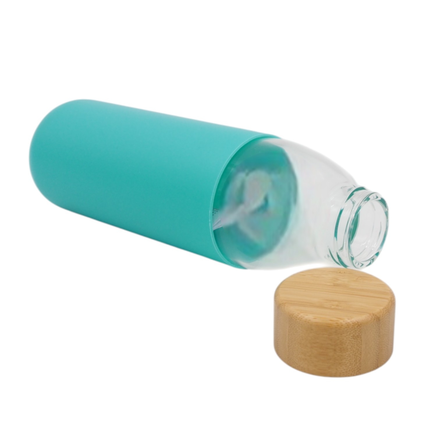 Stiklinė gertuvė su bambuko dangteliu ir žalsvai mėlyna silikonine apsauga Moderni ir ekologiška stiklinė gertuvė – stilingas pasirinkimas kasdieniam naudojimui. Ji puikiai tinka tiek darbui, tiek sportui ar kelionėms, padėdama palaikyti sveiką įprotį visada turėti vandens po ranka. Aukštos kokybės stiklas – atsparus ir tinkamas tiek šaltam, tiek kambario temperatūros vandeniui bei kitiems gėrimams.Natūralaus bambuko…