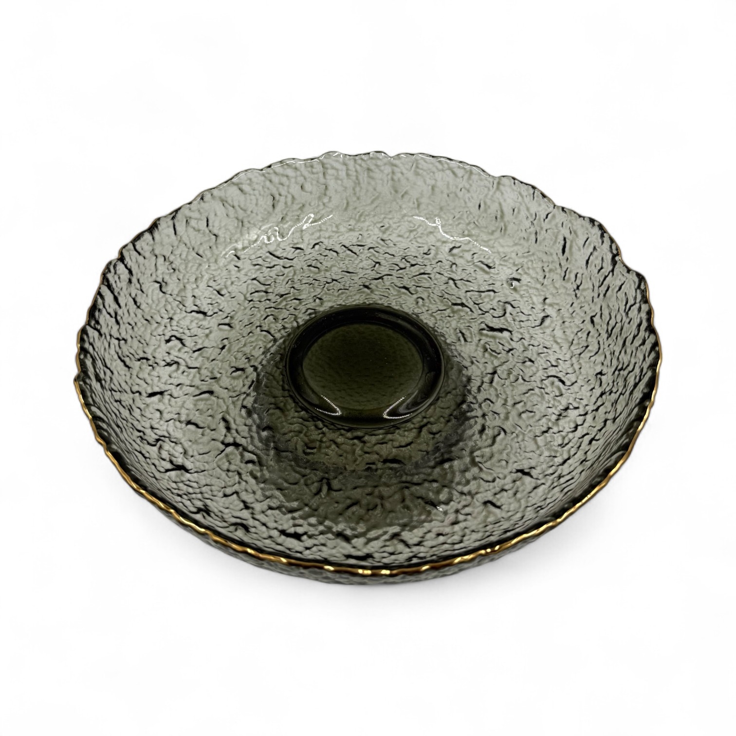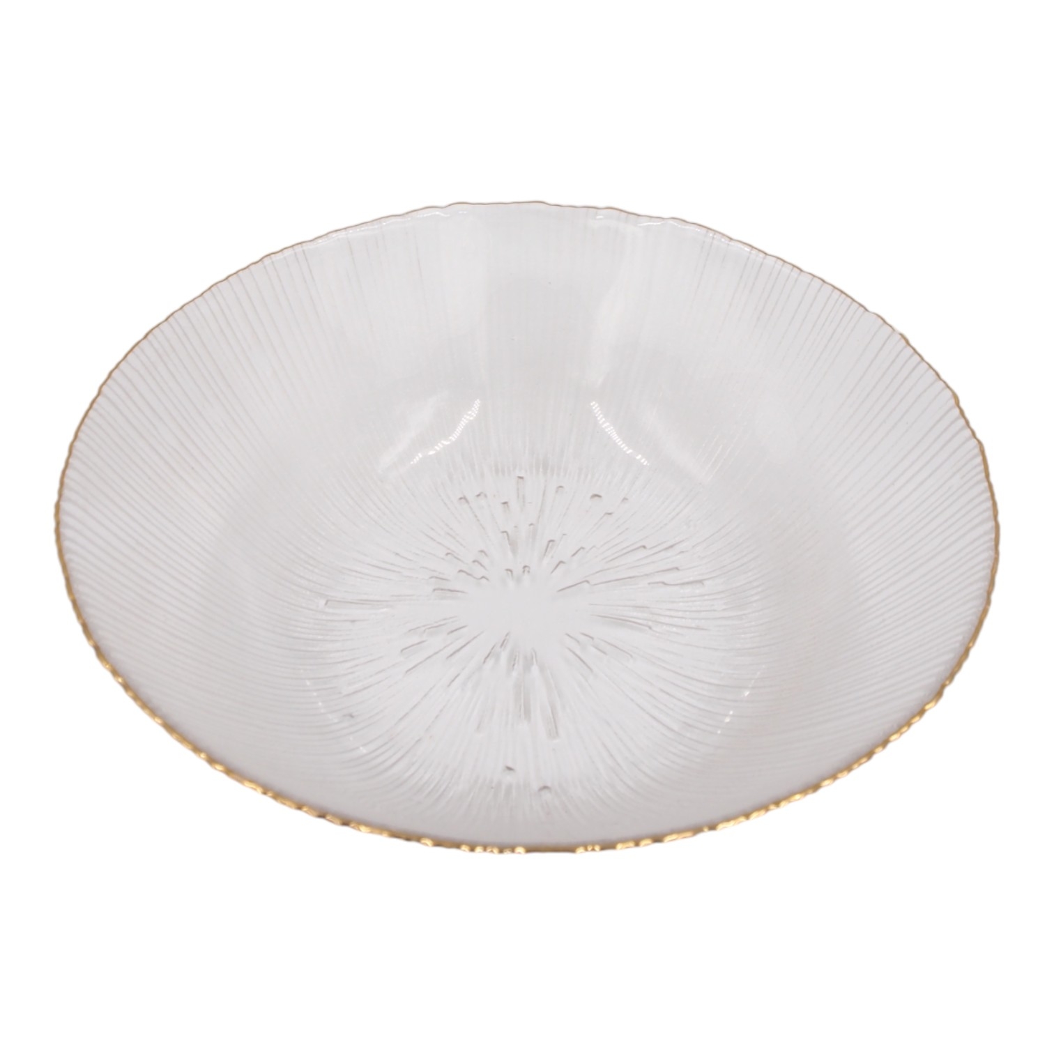 Stiklinė dubenėlis 24,5 cm su auksiniu krašteliu Išskirtinio dizaino stiklinis dubenėlis su subtiliomis tekstūromis ir elegantišku auksiniu krašteliu. Skaidrus paviršius bei švelnios linijos suteikia prabangos įspūdį, todėl šis indas puikiai tiks tiek kasdieniam naudojimui, tiek šventiniam stalo serviravimui. Skersmuo: 24,5 cm Medžiaga: aukštos kokybės stiklas Dekoruotas auksiniu krašteliu Idealiai tinka salotoms, vaisiams ar kitiems patiekalams…