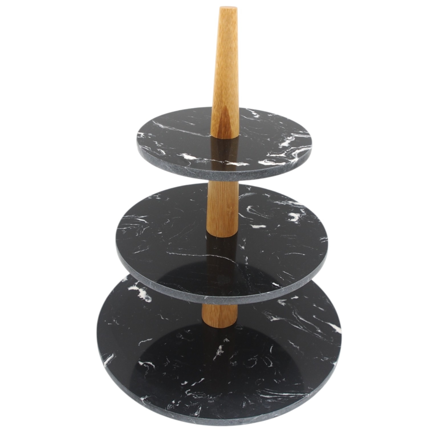 3 aukštų marmurinis serviravimo stovas „Tessie & Jessie“ Elegantiškas 3 aukštų serviravimo stovas iš juodo marmuro imitacijos paviršių ir bambuko medžio rankenos – puikus pasirinkimas desertams, vaisiams, užkandžiams ar pyragėliams patiekti. Stovas ne tik funkcionalus, bet ir stilingas, todėl taps išskirtine jūsų šventinio ar kasdieninio stalo detale. Savybės: 3 aukštų serviravimo stovas. Pagamintas iš marmuro…