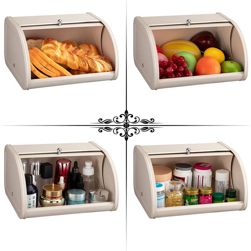 Metalinė duoninė „Bakery“ su ritinine dangčio sistema Klasikinio dizaino metalinė duoninė padės išlaikyti duoną, bandeles ir kitus kepinius šviežius bei apsaugotus nuo išdžiūvimo. Šviesiai kreminės spalvos duoninė su užrašu „Bakery“ taps praktišku ir stilingu virtuvės akcentu. Tvirta metalinė konstrukcija – ilgaamžiška ir lengvai valoma.Ritinio tipo dangtis – lengvai atsidaro ir užsidaro, užtikrinant patogų naudojimą.Erdvi talpa…