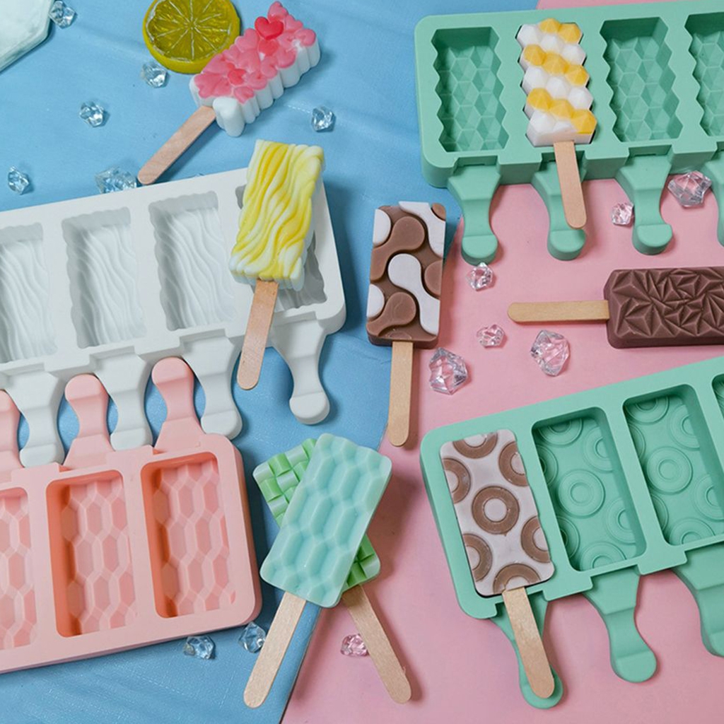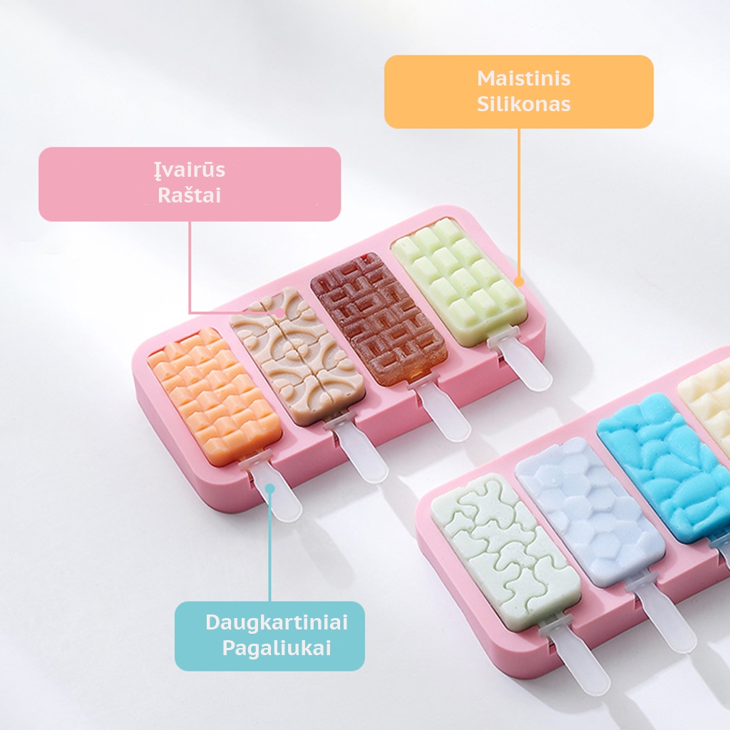Silikoninė forma ledams TR1412 Silikoninė ledukų forma puikiai tiks rankų darbo skanėstams gaminti. Telpa 4 vnt. ledų porcijos. Modelis parenkamas atsitiktinai. Bendri išmatavimai: 16,5X8 cm. Saugus ir tinkamas sąlyčiui su maistų silokonas. Vienos porcijos išmatavimai: 3,3X6,3 cm.(be pagaliuko) Pridedami daugkartinias pagaliukai.