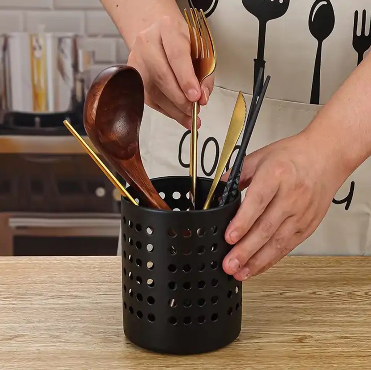 Universalus, metalinis stalo įrankių sausintuvas. Įrengtas tankus skylių tinklas (taip pat ir pagrinde), kuris neleidžia kauptis drėgmei. Plonas dizainas, subtili išvaizda tinka bet kuriai virtuvei. Produkto savybės ir specifikacijos: Medžiaga: plienas. Aukštis: 15 cm. Skersmuo: 12 cm. Juoda spalva. Plastikinė pakuotė.