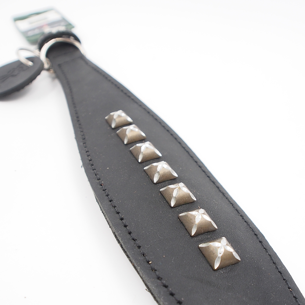Išskirtinio dizaino „Hunter“ antkaklis pagamintas iš aukštos kokybės juodos odos ir dekoruotas blizgiomis kvadratinėmis kniedėmis – tai puikus stiliaus ir patikimumo derinys. Dėl švelniai praplatintos vidurinės dalies antkaklis tolygiai paskirsto spaudimą, užtikrindamas patogumą net aktyviai judančiam šuniui. Tvirtas metalinis žiedas ir sagtis garantuoja saugų naudojimą bei lengvą dydžio reguliavimą.