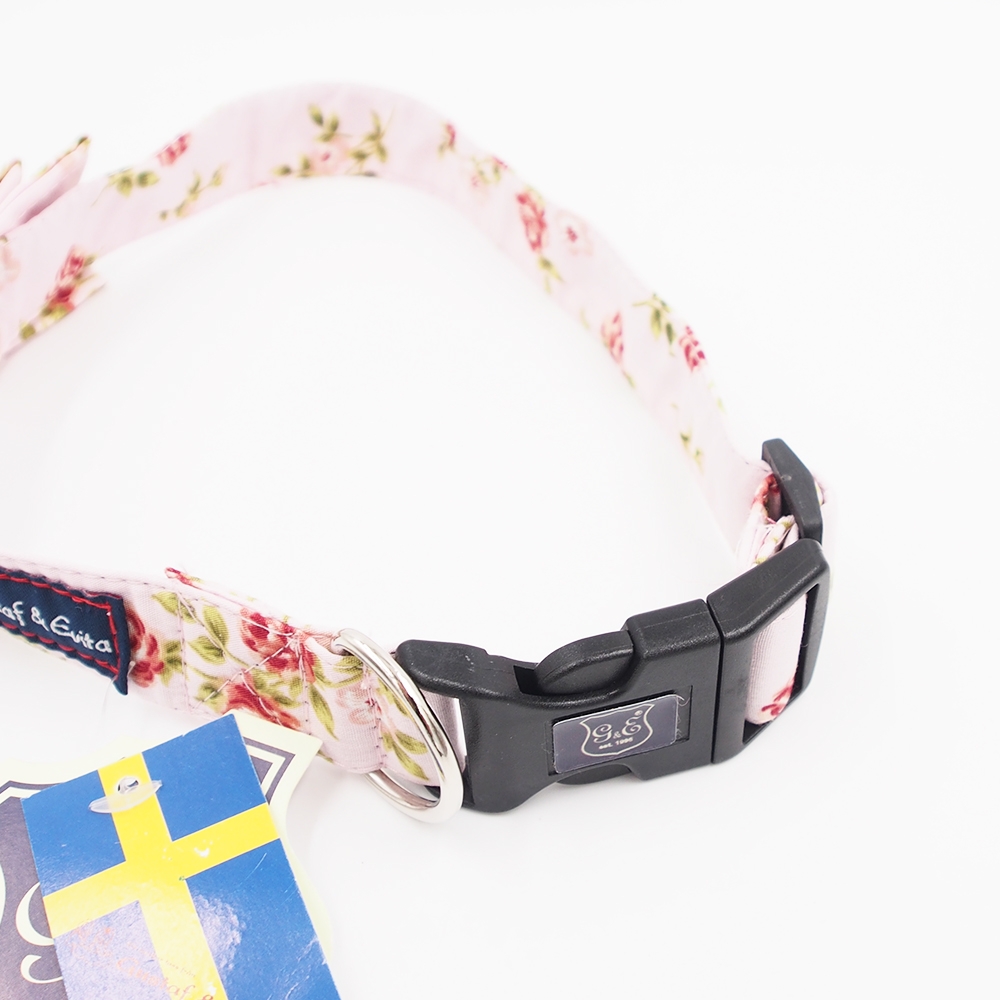 Elegantiškas ir išskirtinio dizaino Gustaf & Evita antkaklis šunims, dekoruotas subtiliu rožių raštu ir stilingu kaspinu. Pagamintas iš minkštos, odai draugiškos medžiagos, kuri užtikrina šuns komfortą net ir ilgo nešiojimo metu. Plastikinė sagtis leidžia greitai ir patogiai uždėti bei nuimti antkaklį, o metalinis žiedas skirtas prisegti pavadėlį.