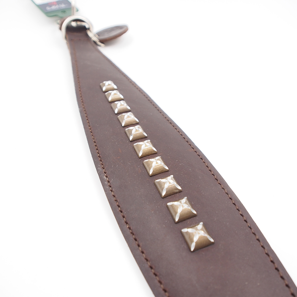 Išskirtinio dizaino Hunter antkaklis iš aukščiausios kokybės natūralios rudos odos su dekoratyvinėmis metalinėmis kniedėmis. Puikiai tinka ieškantiems patikimo ir tuo pačiu stilingo sprendimo savo augintiniui. Antkaklis yra platus, minkštas ir patogus, idealiai tinkantis vidutinio ir didelio dydžio šunims.