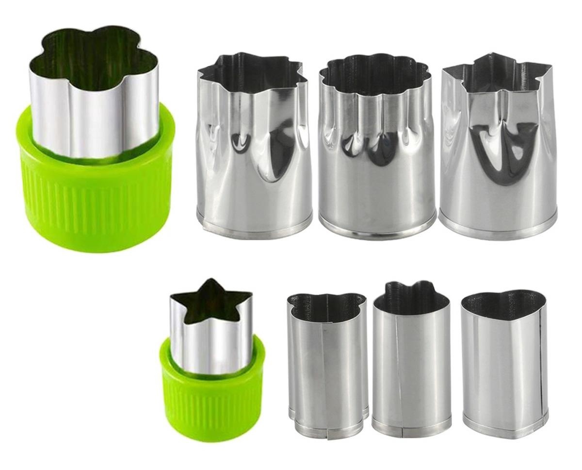 8 funkcionalių daržovių ir vaisių pjaustyklių rinkinys. Kiekviena iš formų leidžia patogiai pjaustyti įvairių formų daržoves ir vaisius. Patogios plastikinės pagalvėlės apsaugo rankas nuo įpjovimų.