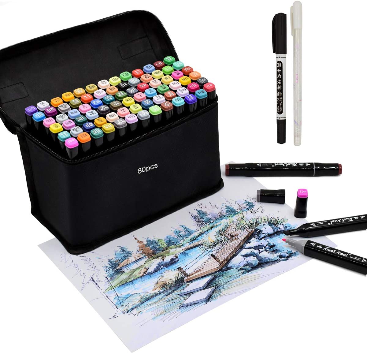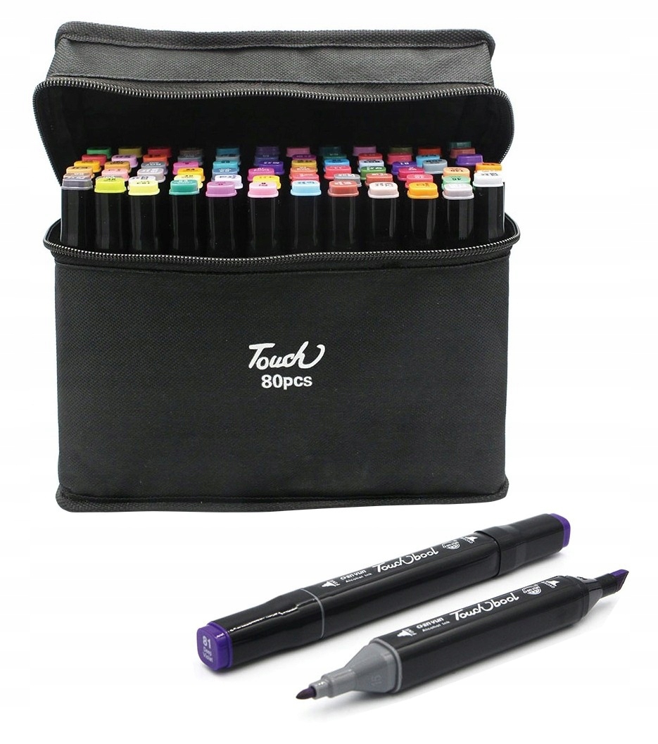 Dvipusių markerių / flomasterių rinkinys, 80 skaidrių spalvų. Kiekvienas žymeklis turi 2 antgalius (platus ir tikslus). Žymekliai, pagaminti iš netoksiškų medžiagų, yra supakuoti į patogų dėklą su nešiojimo rankena.