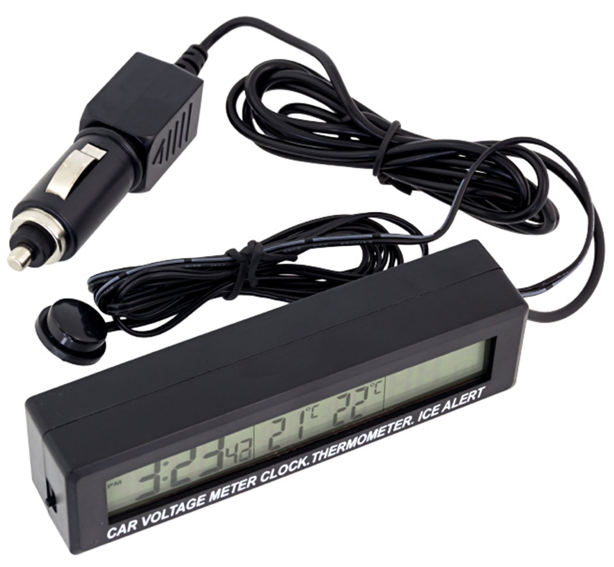 Elektroninis automobilio termometras su laikrodžiu ir akumuliatoriaus įkrovos lygio indikatoriumi.