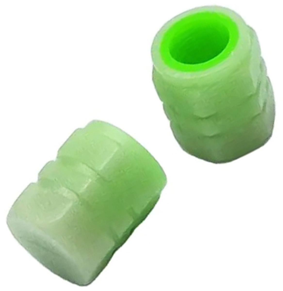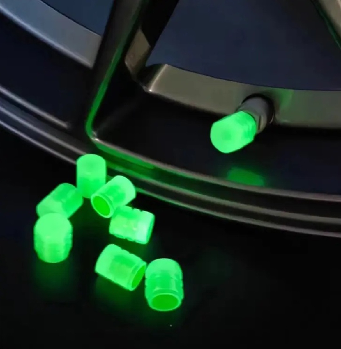 Dviejų fluorescencinių automobilio dangtelių rinkinys. Šviečia žaliai, todėl ratai atrodo patraukliai tamsoje. Suderinamas tik su automobilių vožtuvais – netinka dviračio ratams.