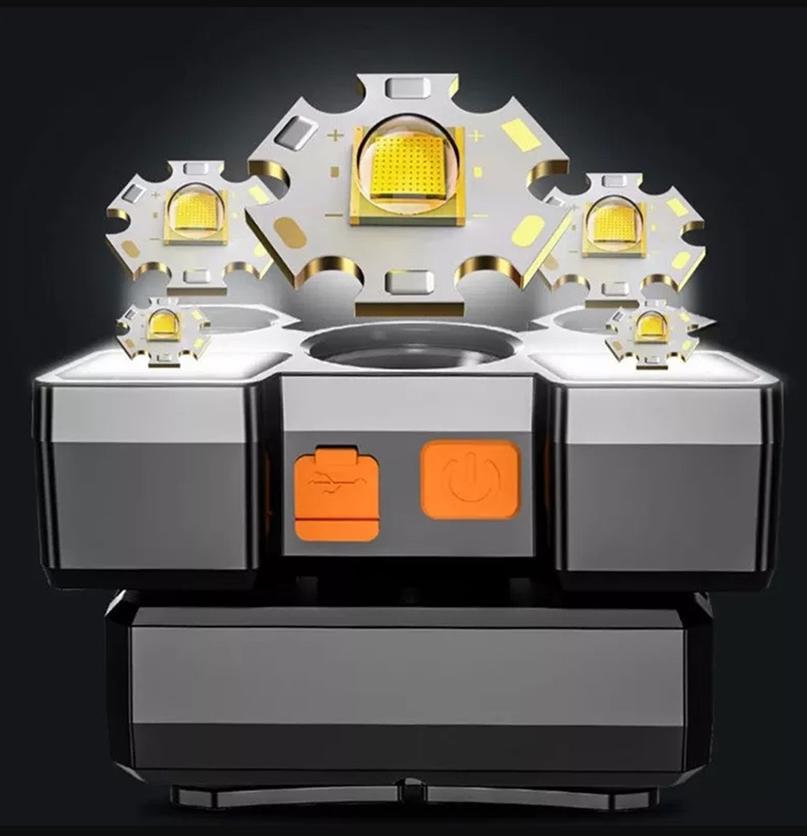 LED XPE žibintuvėlis su 9 galingais šviesos diodais. Korpusas pagamintas iš patvaraus plastiko. Žibintuvėlis turi stiprų šviesos šaltinį – 9x XPE LED, kurio tarnavimo laikas iki 100 000h. Tvirta galvos rankena užtikrina patogų valdymą. Įrenginys naudoja įmontuotą bateriją, kurią galima lengvai įkrauti naudojant pridedamą USB laidą. Žibintuvėlis taip pat yra atsparus vandeniui ir smūgiams. Jungiklis tvirtinamas tvirta guma, o uždėti sandarinimo žiedai apsaugo įrenginį nuo nešvarumų ir dulkių.