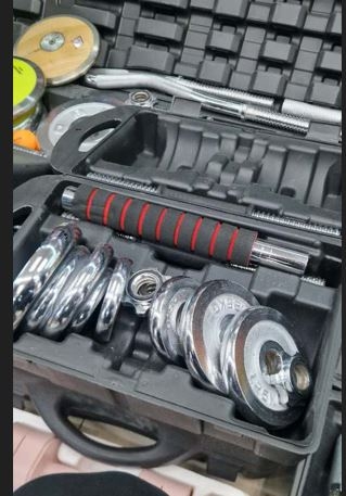Chromuotos svarmenų plokštės, neslystančios rankenos ir tvirtas sujungimo mechanizmas užtikrina maksimalų komfortą, stabilumą ir saugumą treniruotėse. Visi elementai tvarkingai susideda į patogią ir tvirtą lagamino tipo dėžę, todėl įranga lengvai transportuojama ir laikoma.