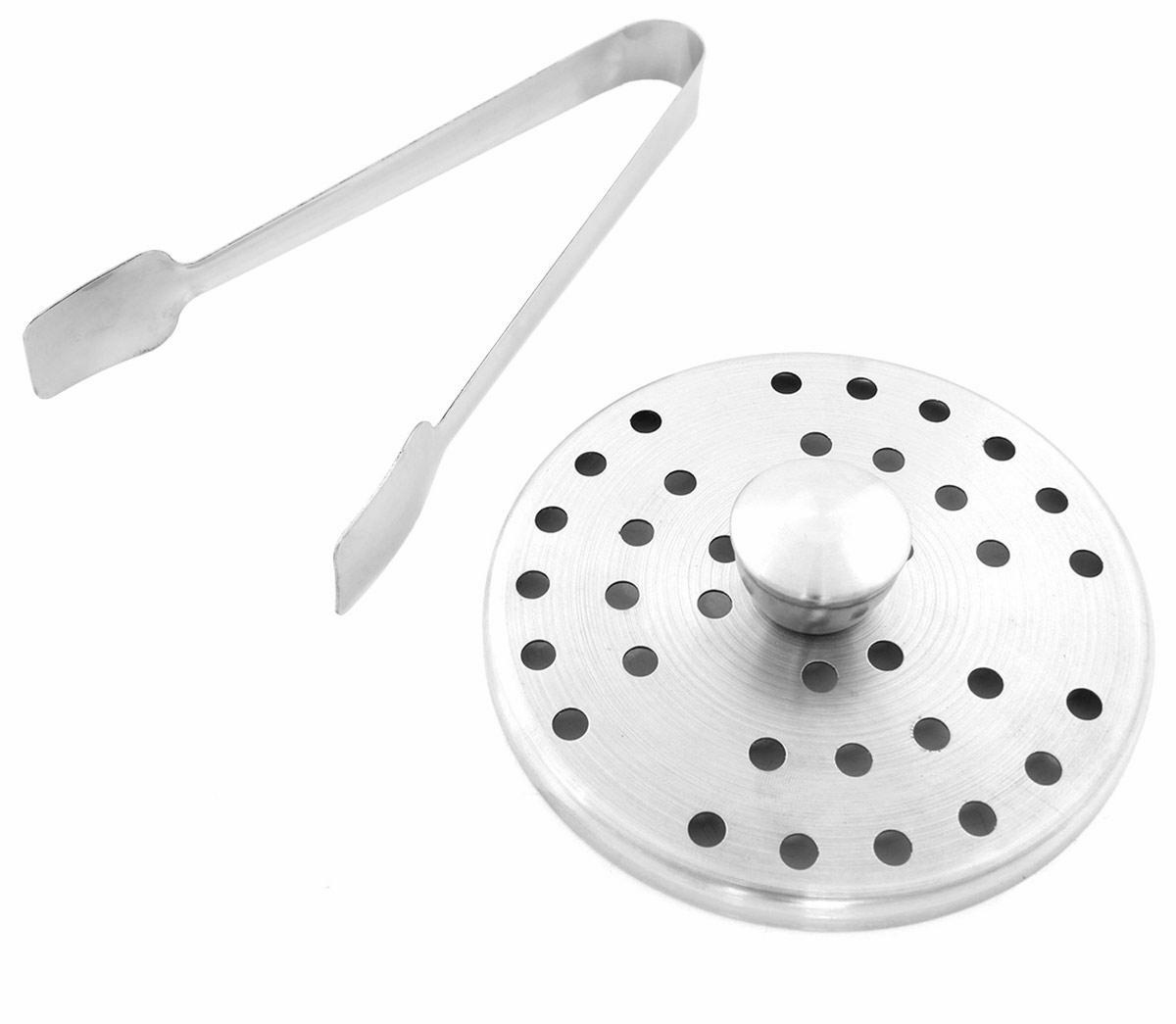 - Kibiras turi plieninį dangtį, sietelį ir žnyplės ledui.