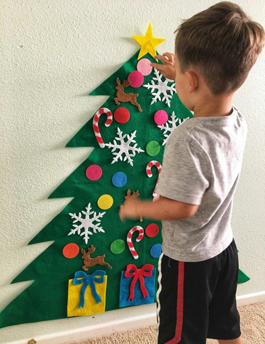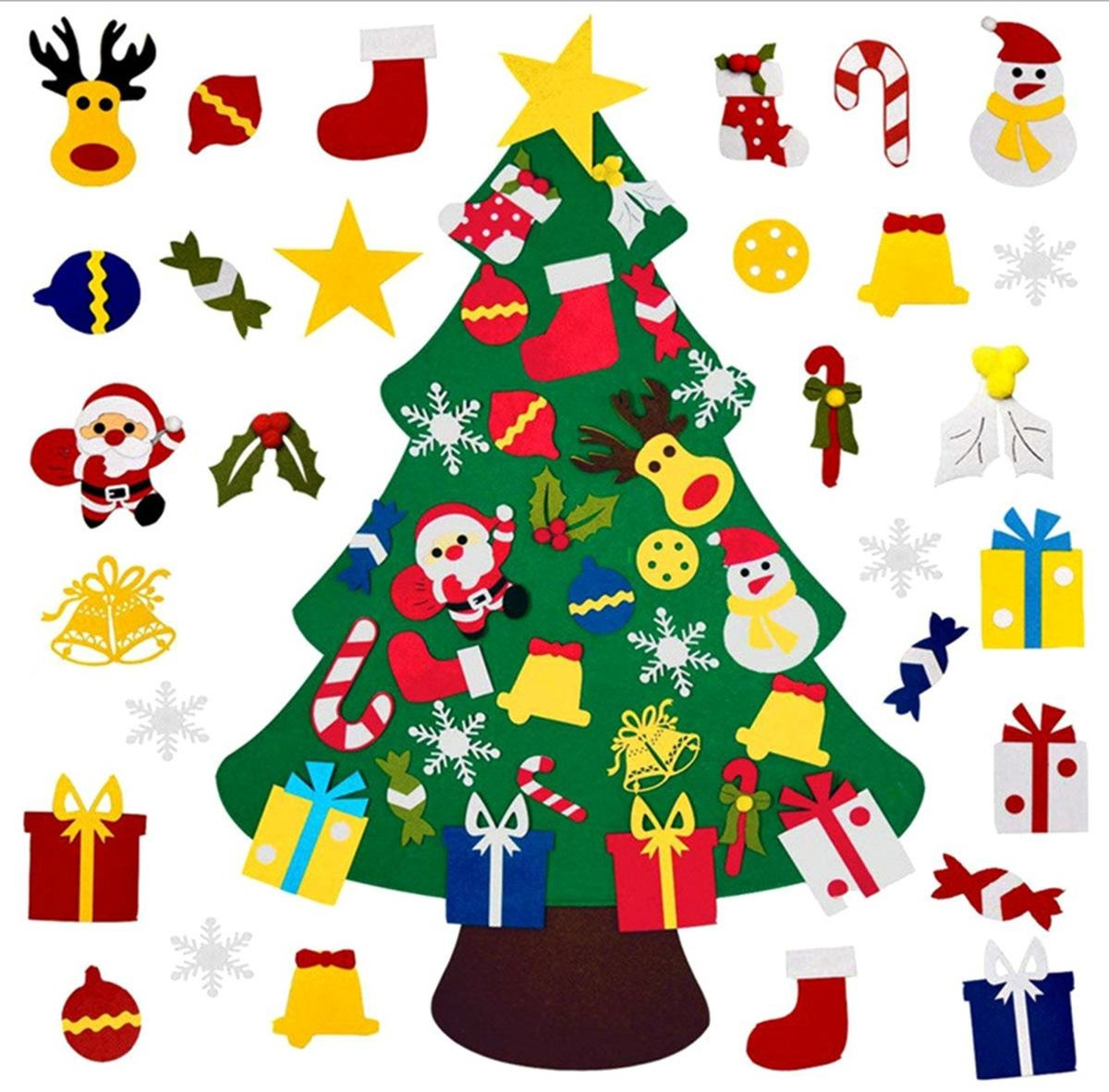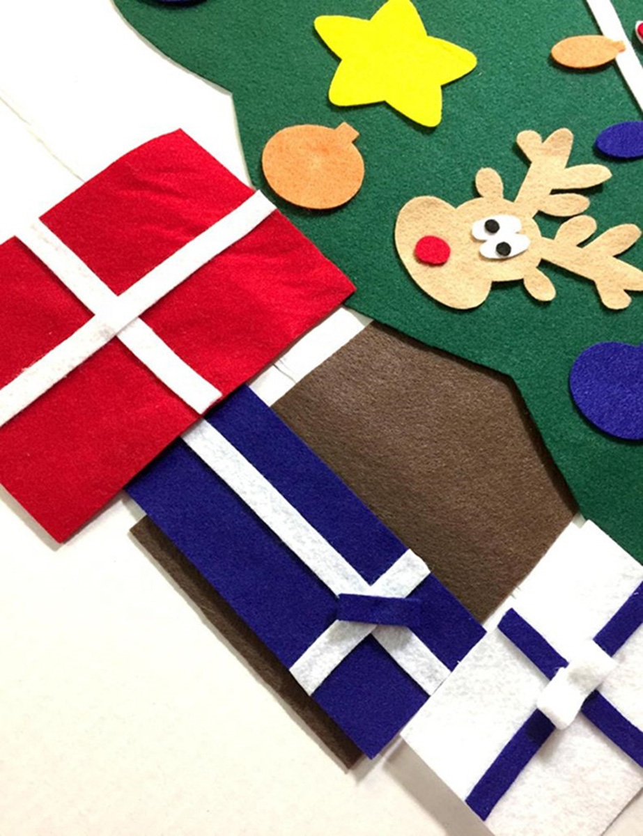 Veltinio medžiagos Kalėdų eglutė vaikams. Puikus žaislas, lavinantis mažiausio kūrybiškumą. Įrengta 30 nuimamų papuošalų, kuriuos galima pritvirtinti ir atsegti bet kurioje eglutės vietoje. Pagaminta iš lengvos ir saugios medžiagos (veltinis). Specialus pakabukas leidžia pakabinti ant sienos.