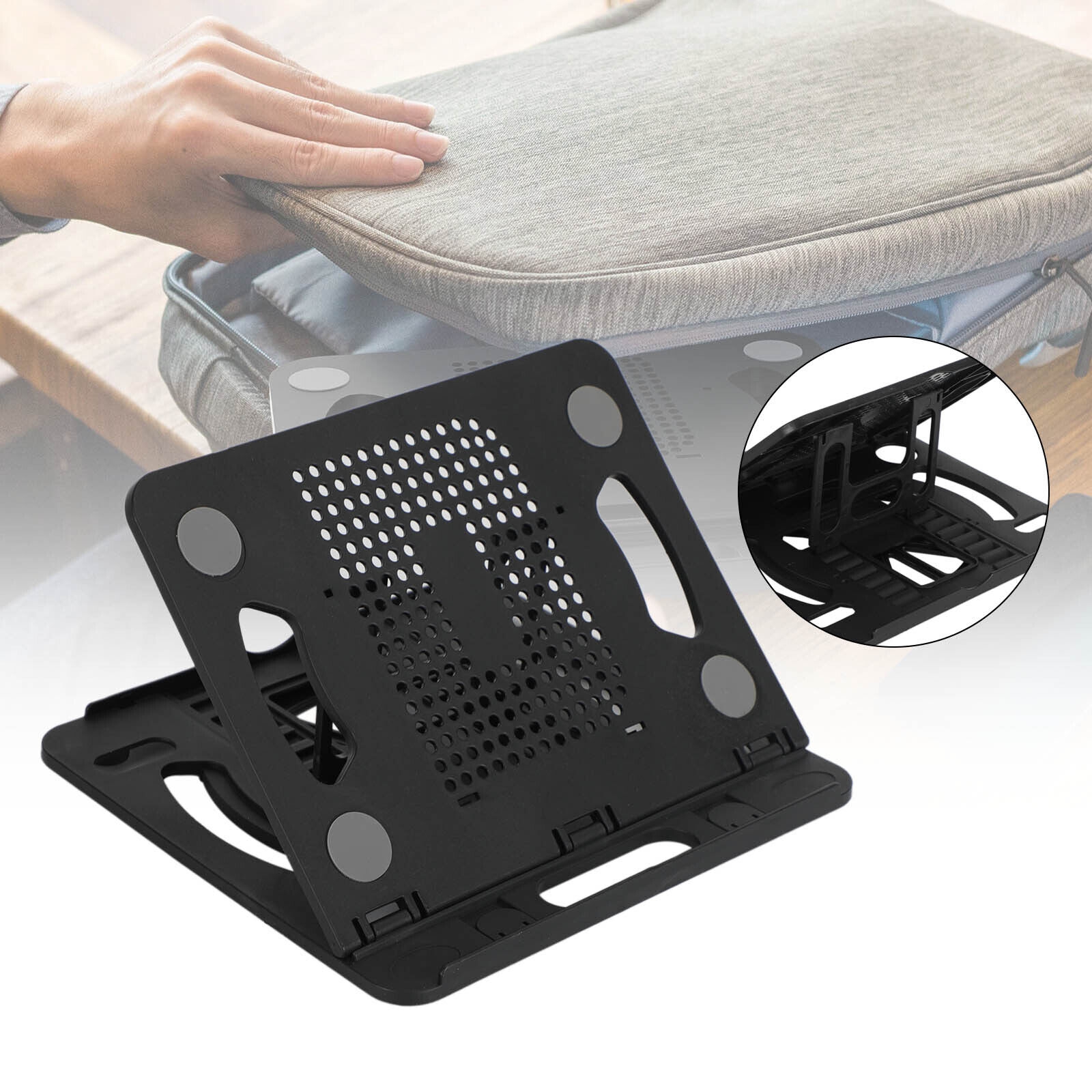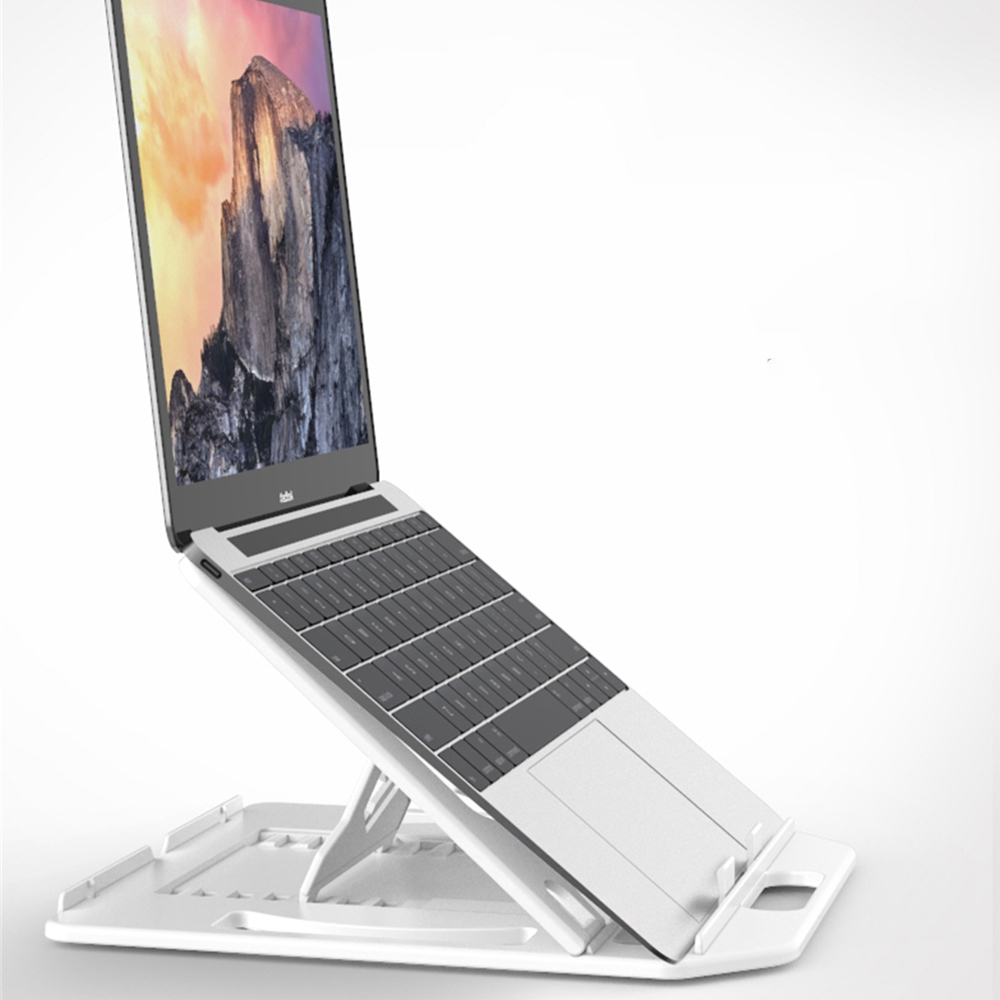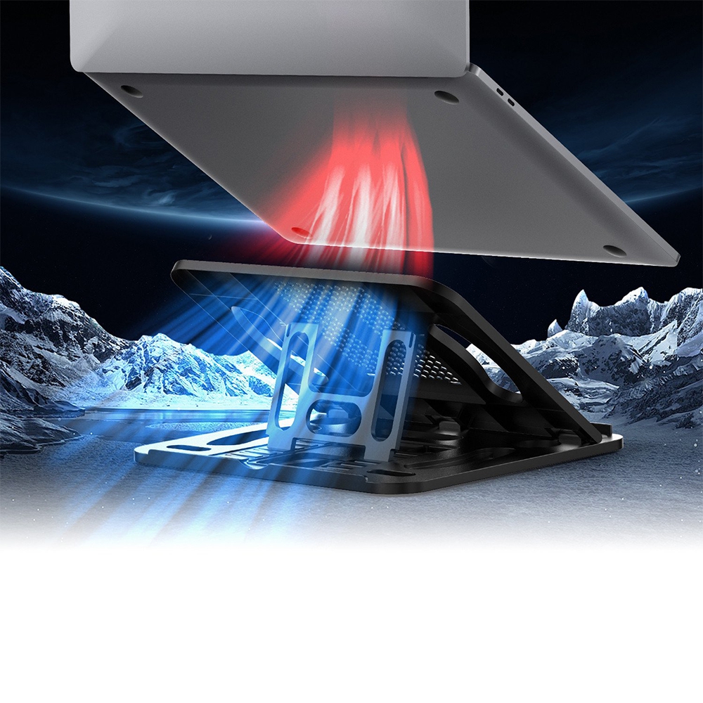 - Pagrindą galima reguliuoti šešiais skirtingais aukščiais ir pločiais. Tai visada tinka jūsų ieškomam kampui ir aukščiui. Neslystantis prietaisas užtikrina, kad stovas ar nešiojamas kompiuteris išliktų vietoje ir neslystų. Kai naudojate stovą, jūsų kompiuteryje taip pat yra laisvos vietos tarp žemės, kad būtų išvengta kompiuterio perkaitimo.
