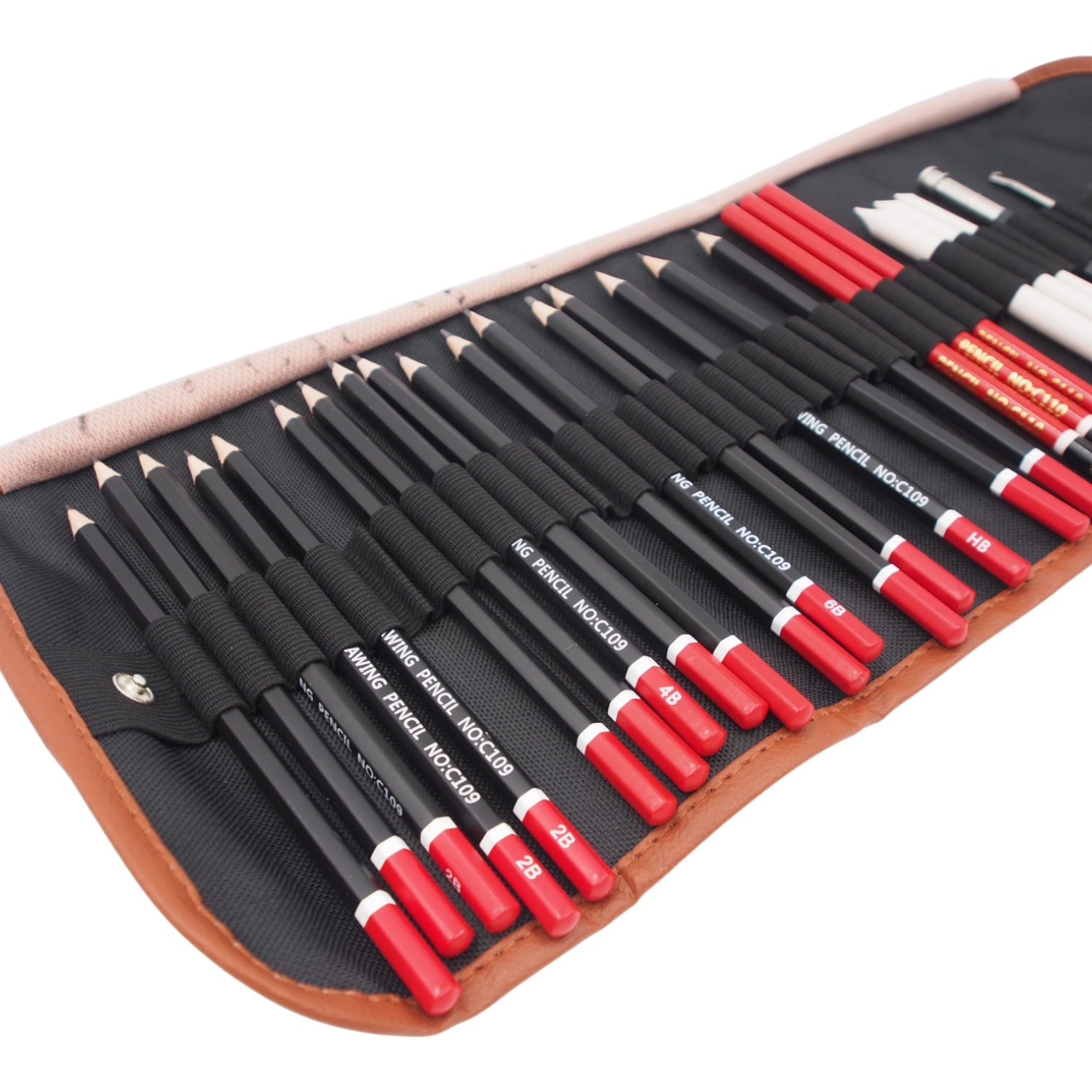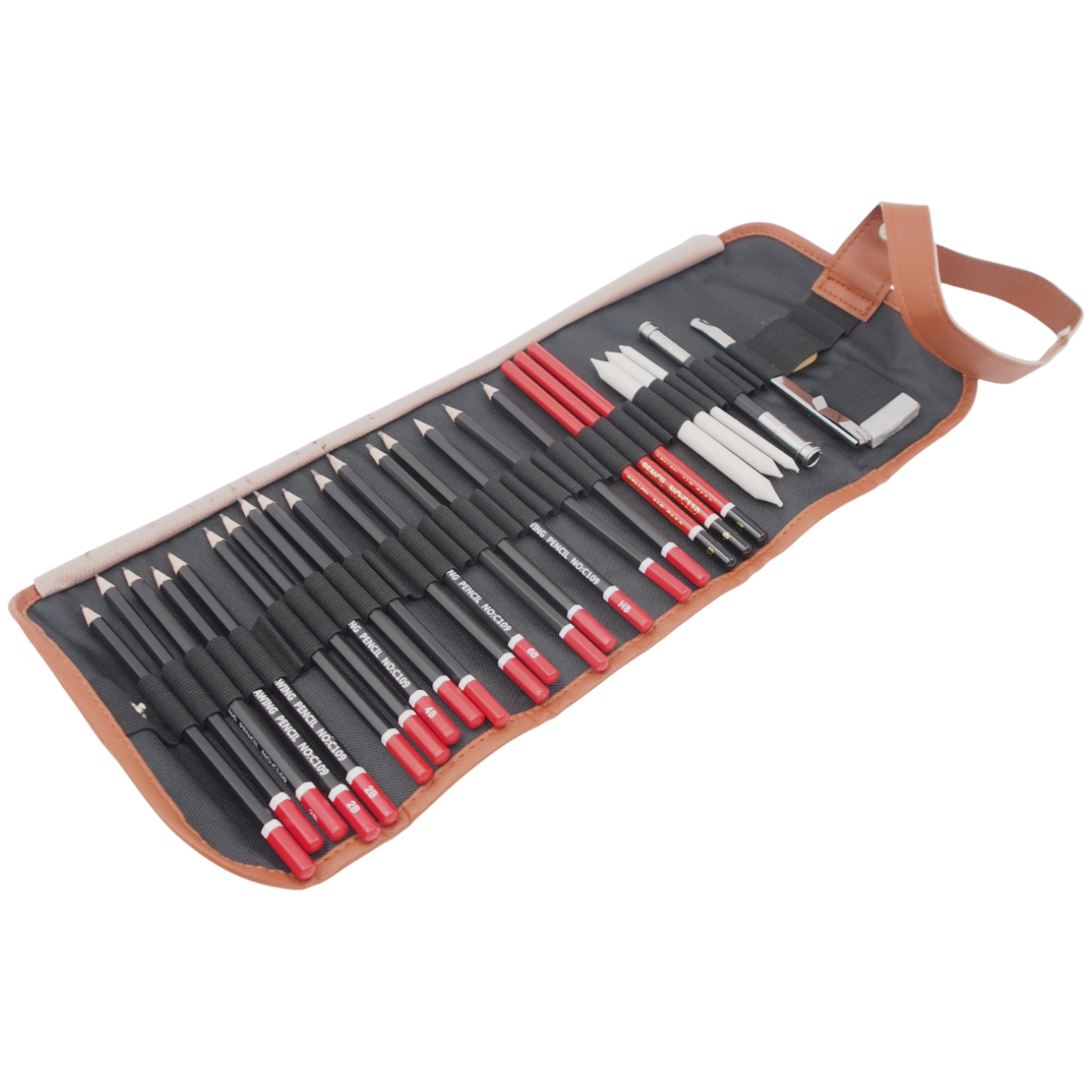 Profesionalus 36 dalių pieštukų ir piešimo reikmenų rinkinys su stilingu susukamu dėklu – tobula dovana kūrybiškumui!
