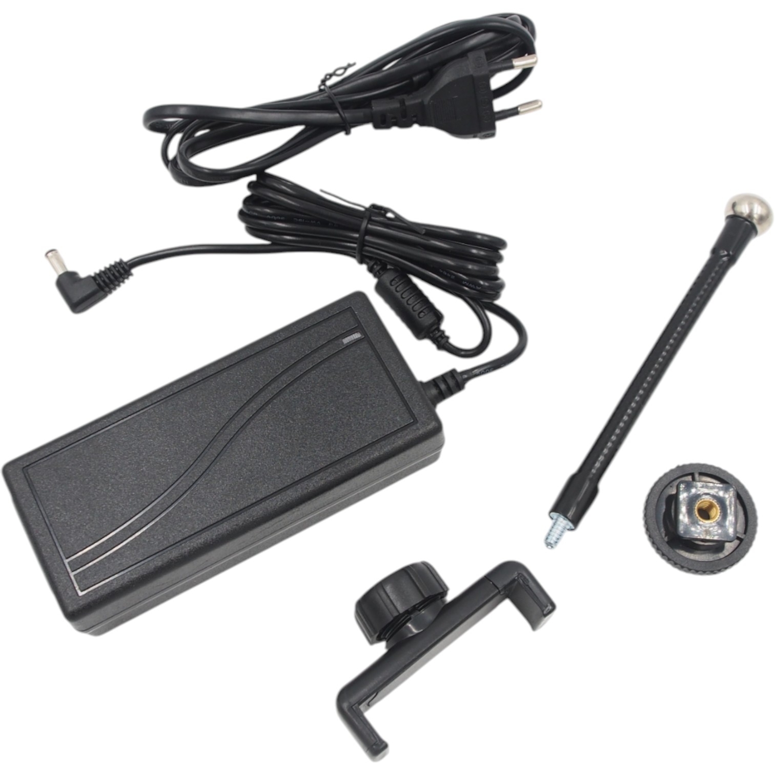 Į komplektą įeina maitinimo adapteris ir priedai telefonui/kamerai pritvirtinti.