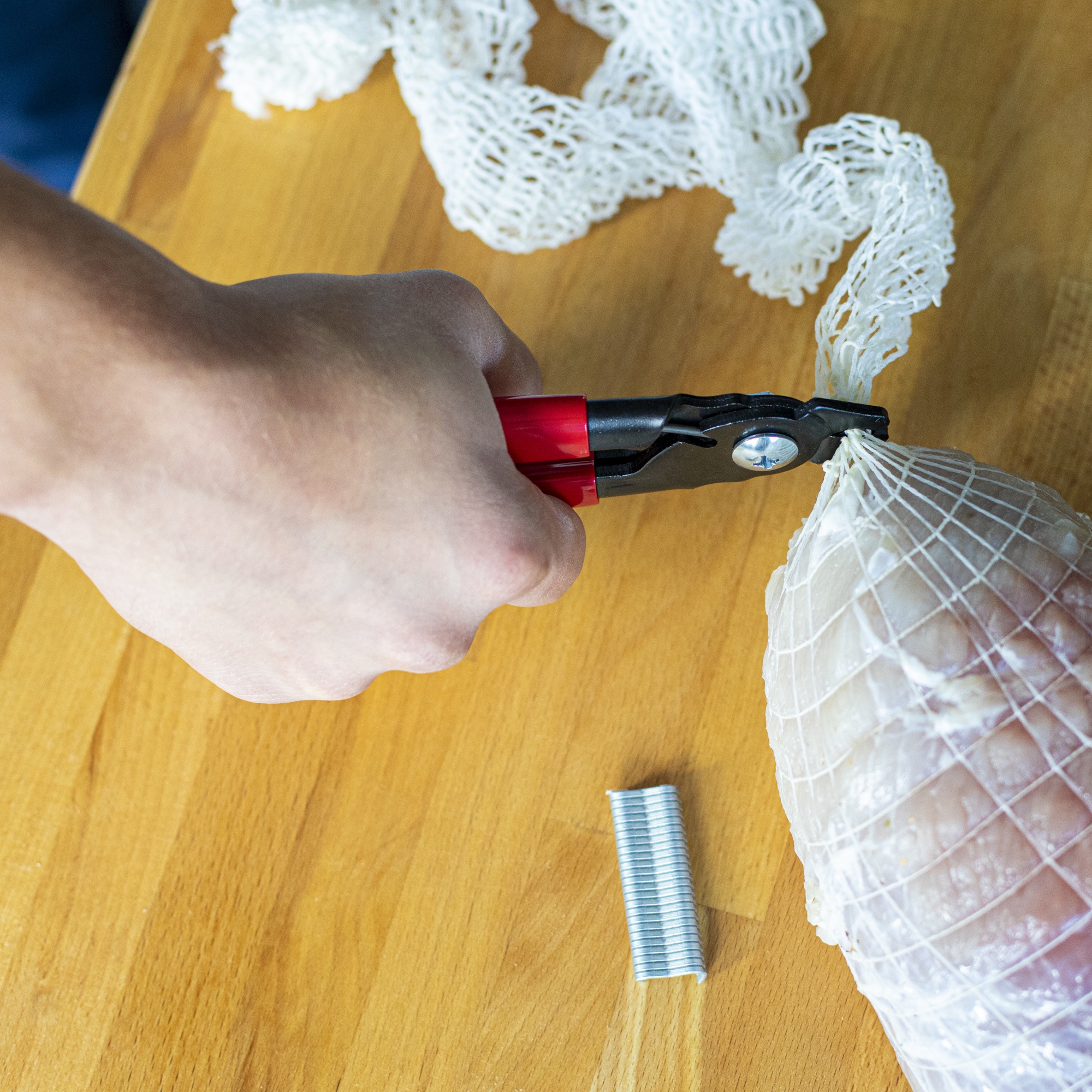 Būtinas pagalbininkas virtuvėje – mėsos spaustukas padeda lengvai uždėti specialius spaustukus ant mėsos tinklelių ir dirbtinių apvalkalų ruošiant mėgstamus mėsos gaminius, dešras ar rūkytą mėsą!
