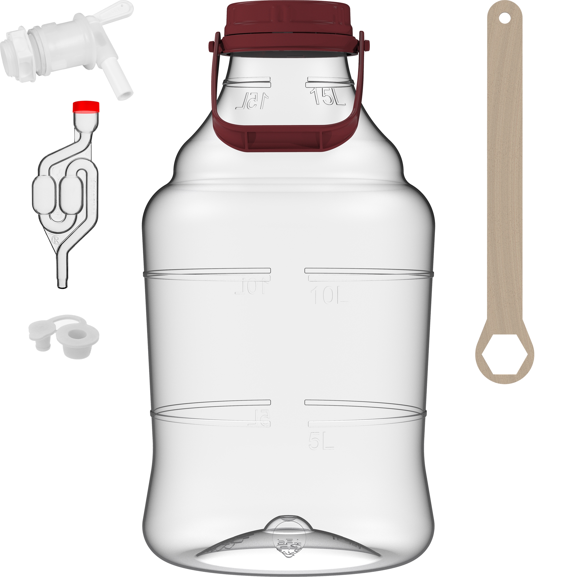 Nesulaužomas 15 l demijonas – sertifikuotas, BPA nemokamas, saugus kontaktui su alkoholiu (net iki 95 %). Jame yra platus atidarymas patogiam vaisių apdorojimui ir patogus rankenos dizainas, leidžiantis lengvai nešti.