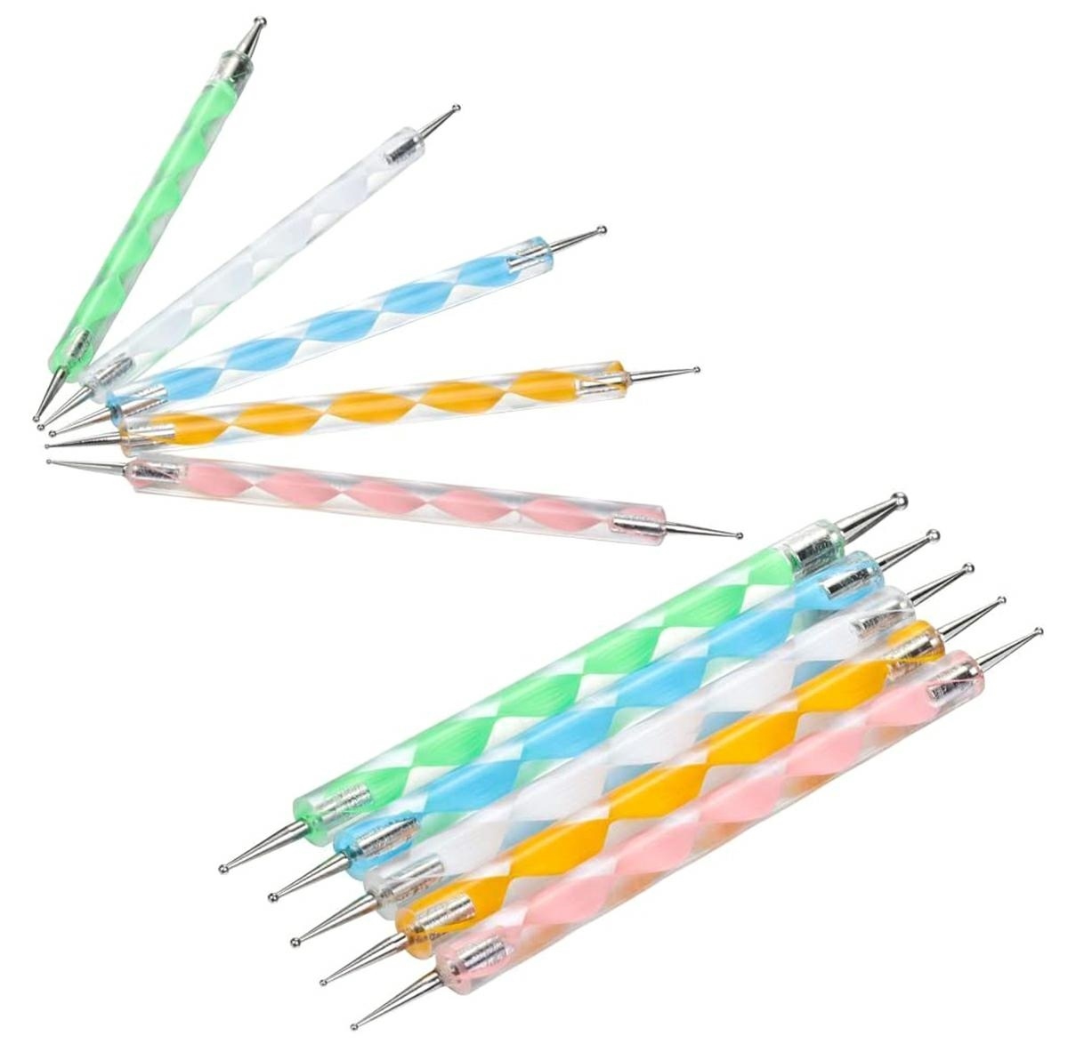 - 5x dvipusiai nagų dailės taškuokliai (įvairių spalvų).