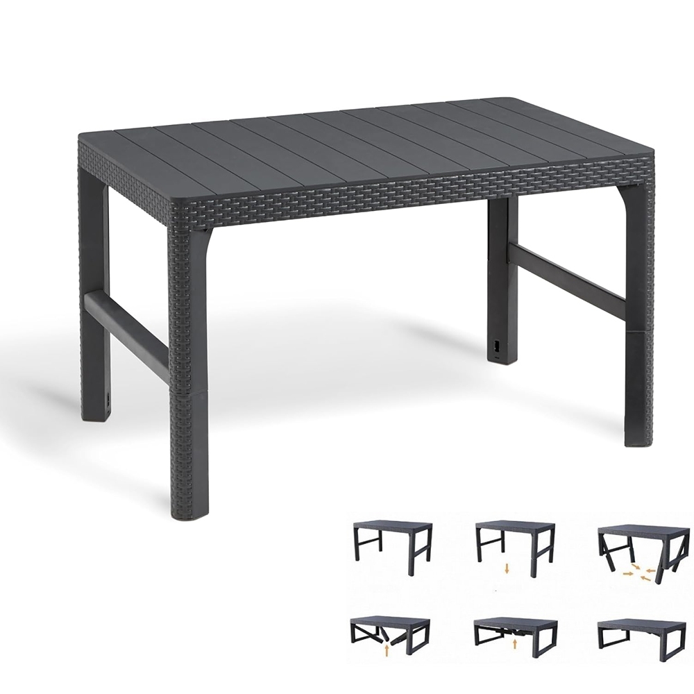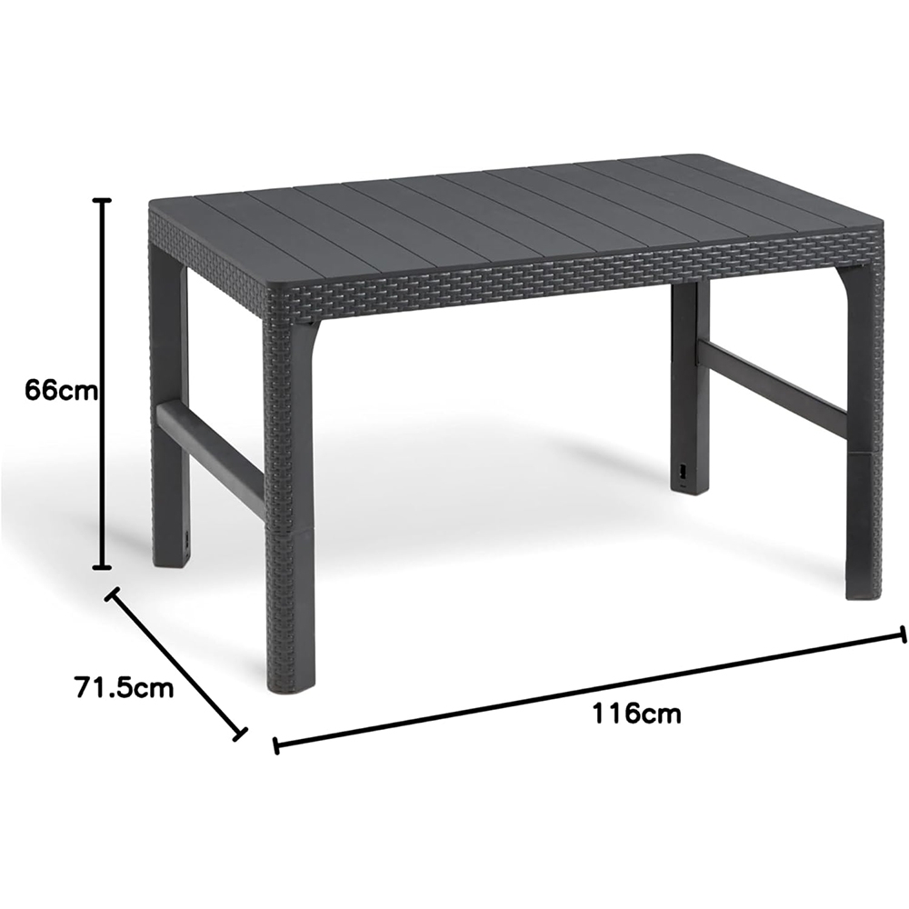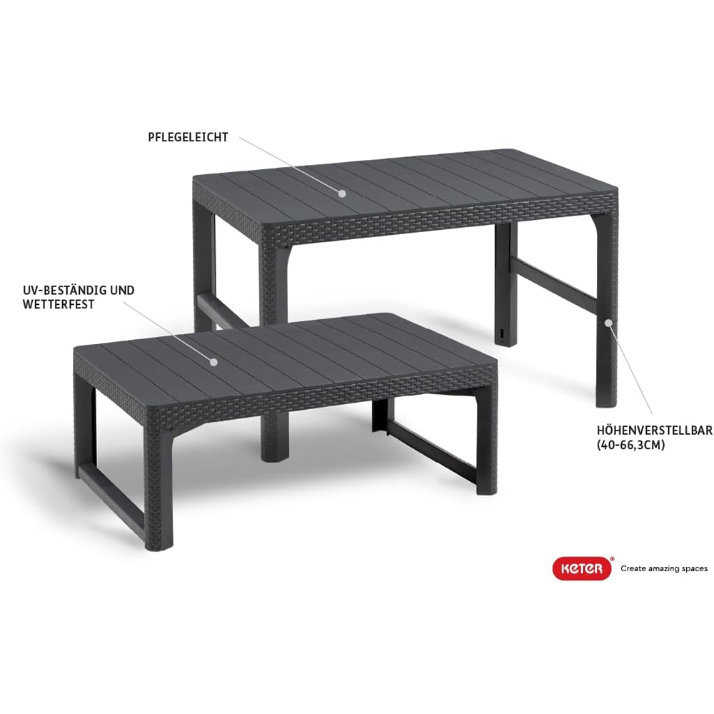 Staliukas pasižymi paprastu, bet stilingu dizainu ir yra pagamintas iš įvairioms oro sąlygoms atsparios bei priežiūros nereikalaujančios medžiagos su modernia plokščia pinta tekstūra bei pasižymi Rezolith stalviršio elegantiška dirbtinės medienos išvaizda. Jums daugiau niekada nereikės jaudintis dėl šių priežiūros nereikalaujančių medžiagų spalvos blukimo, rūdijimo, puvimo ar lupimosi, todėl staliukas puikiai tiks naudoti lauke. Jis yra pristatomas su dvejomis kojelių poromis, todėl jį galėsite naudoti kaip 40cm kavos staliuką arba kaip 66cm valgomojo stalą.