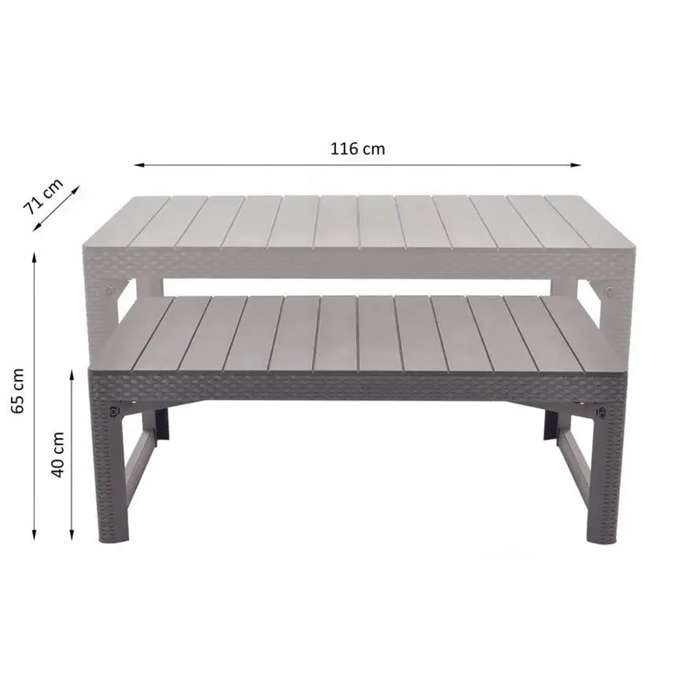 Išplėskite savo sodo baldų komplektą su šiuo daugiafunkciniu, reguliuojamo aukščio staliuku Lyon.