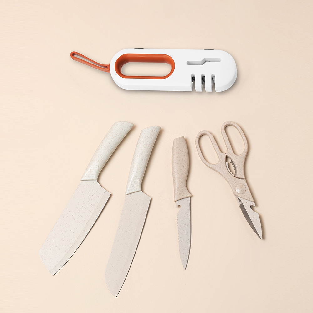 - Dviejų galandimo etapų (šiurkštus galandimas ir tikslus išlyginimas) rinkinys, skirtas ašmenų paruošimui kaip profesionalioje virtuvėje