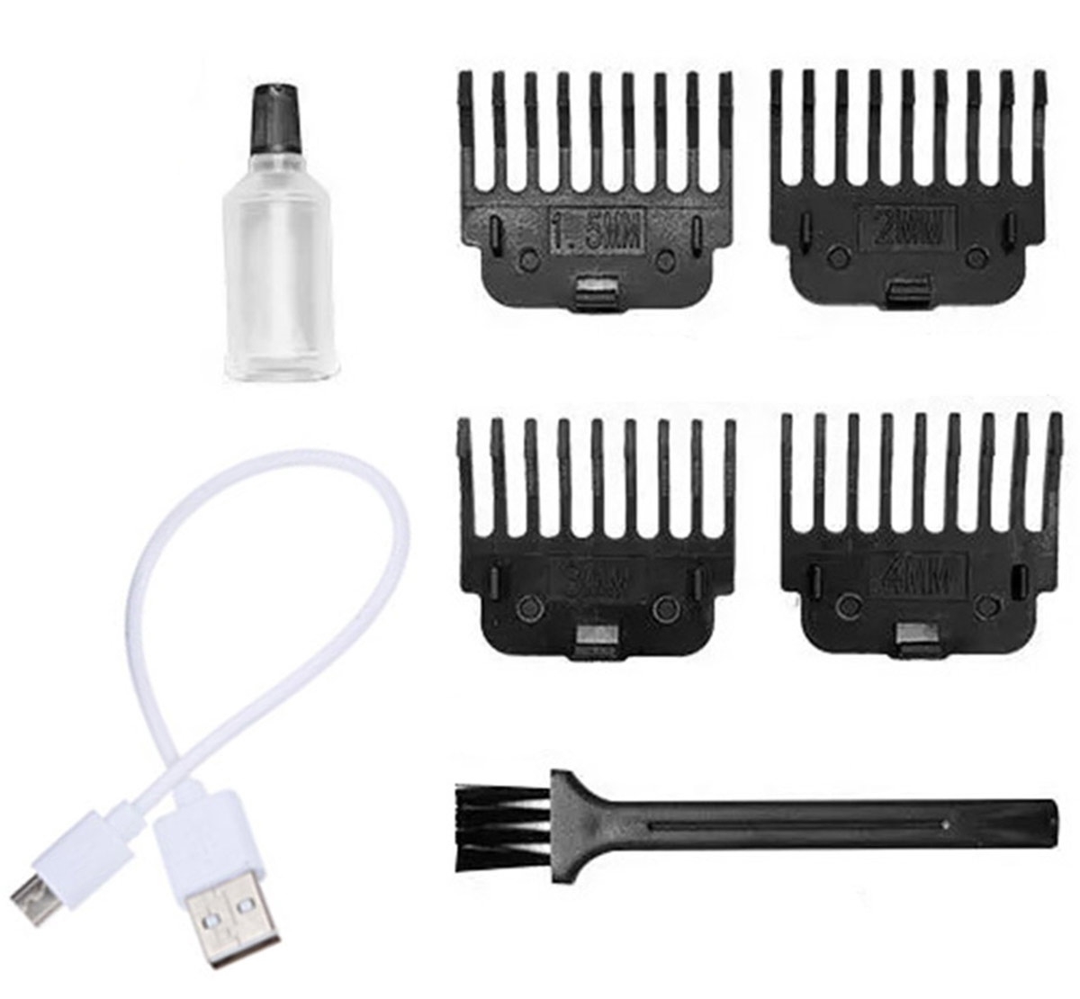 Rinkinyje taip pat yra visi reikalingi priedai, tokie kaip keturi kirpimo priedai, alyva ir valymo šepetys bei maitinimo laidas (taip pat naudojamas akumuliatoriui įkrauti).