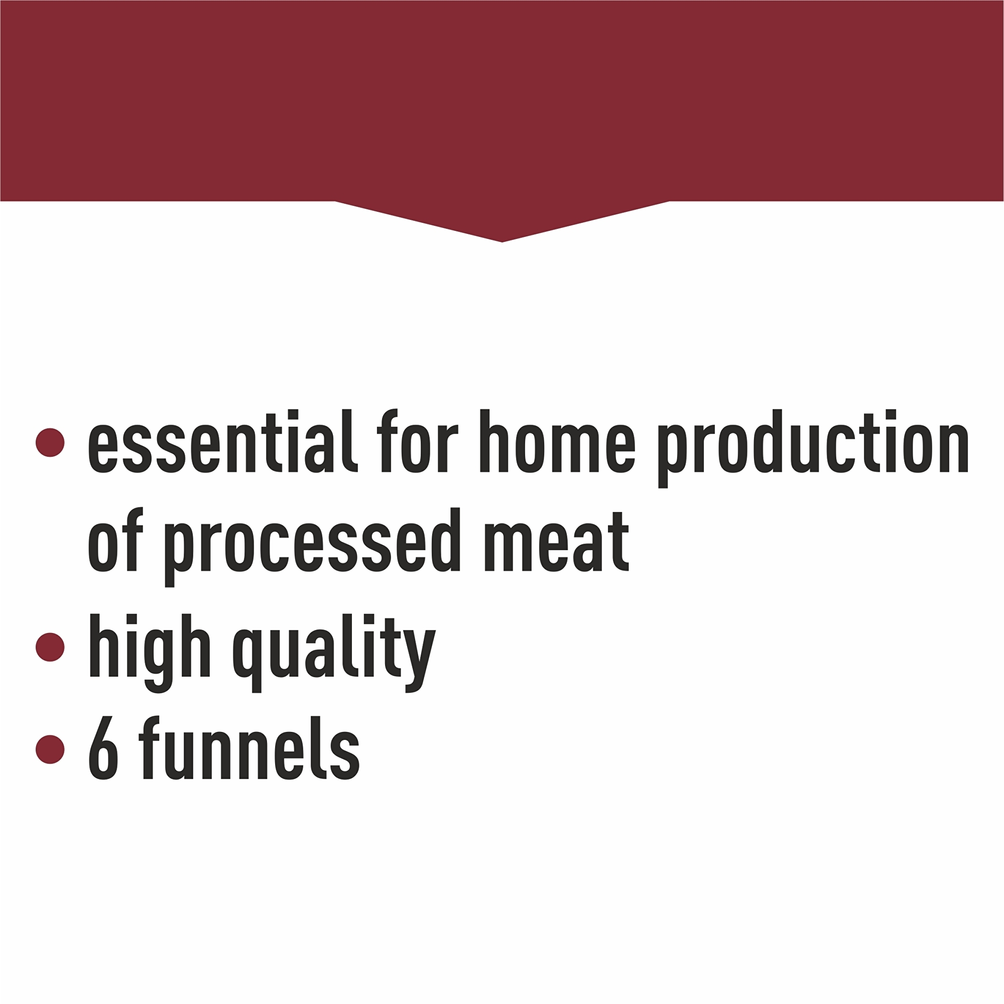 • 6 antgaliai – mūsų gaminys išsiskiria ne tik apgalvotu dizainu, bet ir naudingais priedais: komplekte rasite net 6 skirtingo dydžio antgalius, leidžiančius gaminti mėsos gaminius, kurių skersmuo nuo 14 mm iki 35 mm!