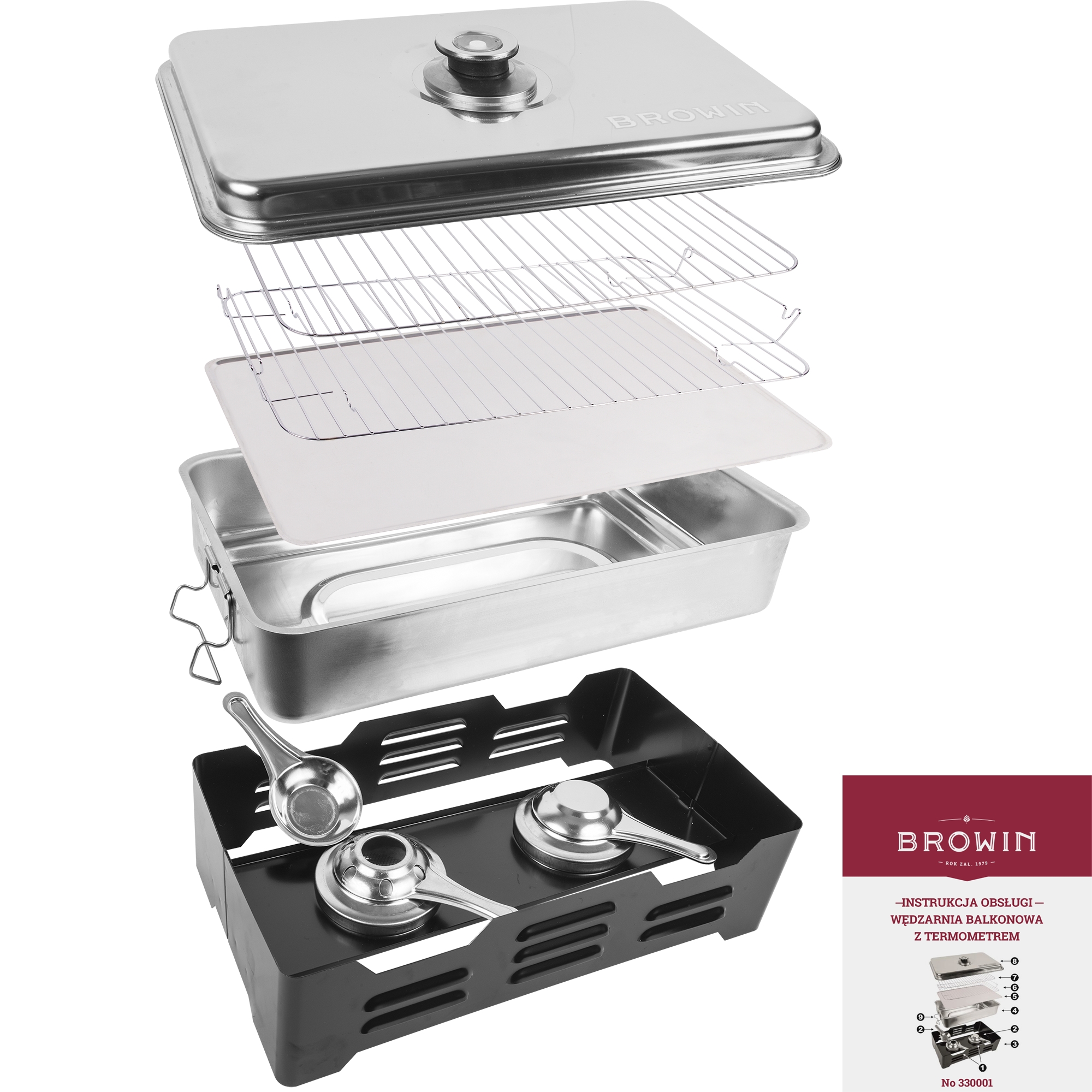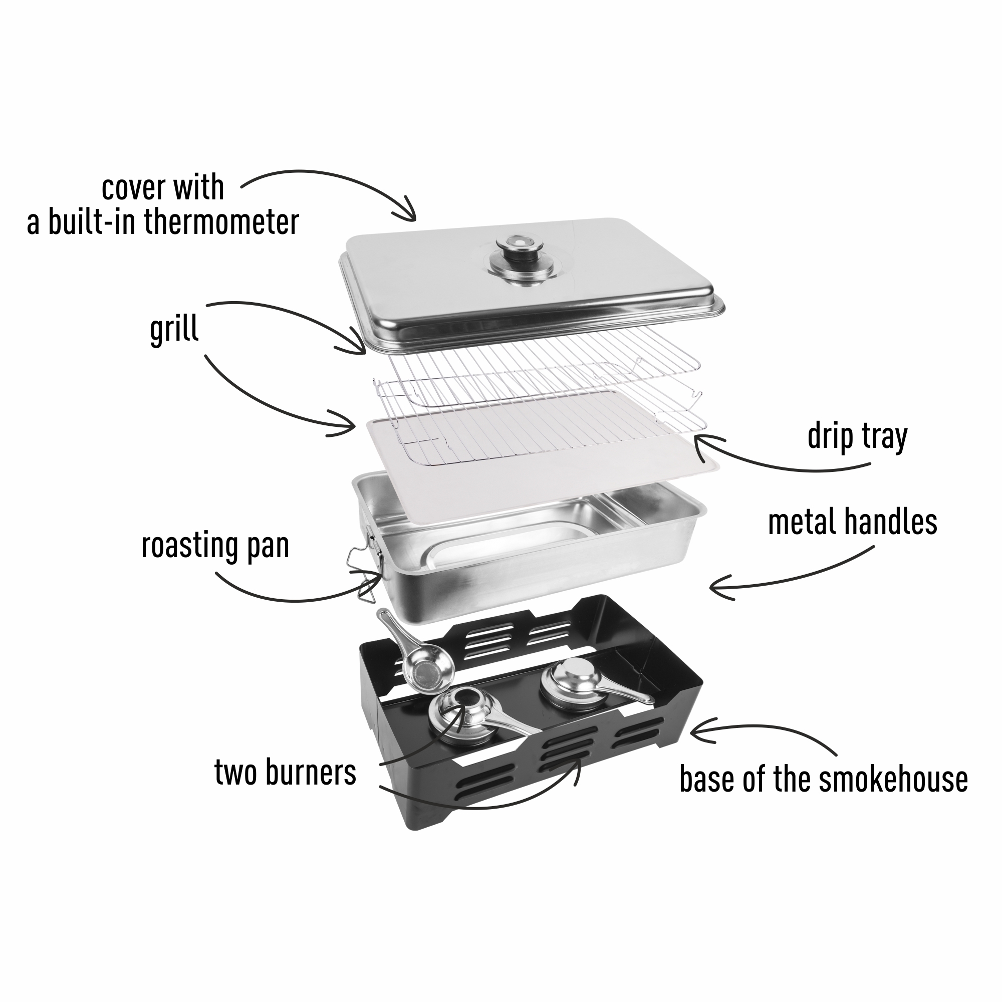 Apgalvotas dizainas – Pagamintas iš tvirto nerūdijančio plieno, šis rūkymo įrenginys yra lengvai valomas ir ilgaamžis. Du gelio degikliai leidžia rūkyti be dujų ar elektros energijos. Medienos skiedros, dedamos į rūkymo įrenginio dugną, kaitinamos iš apačios, gamindamos skonio dūmus, o perteklinis riebalas nuteka į specialų nuotėkų indą, užtikrinant, kad maistas nesusidurtų su liepsna ir kad rūkymo įrenginys skleis labai mažai dūmų.