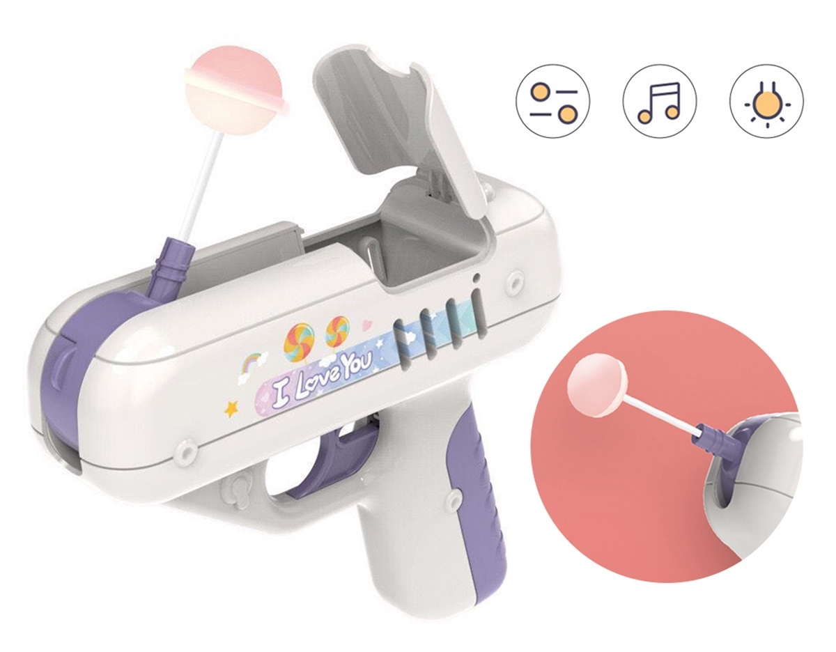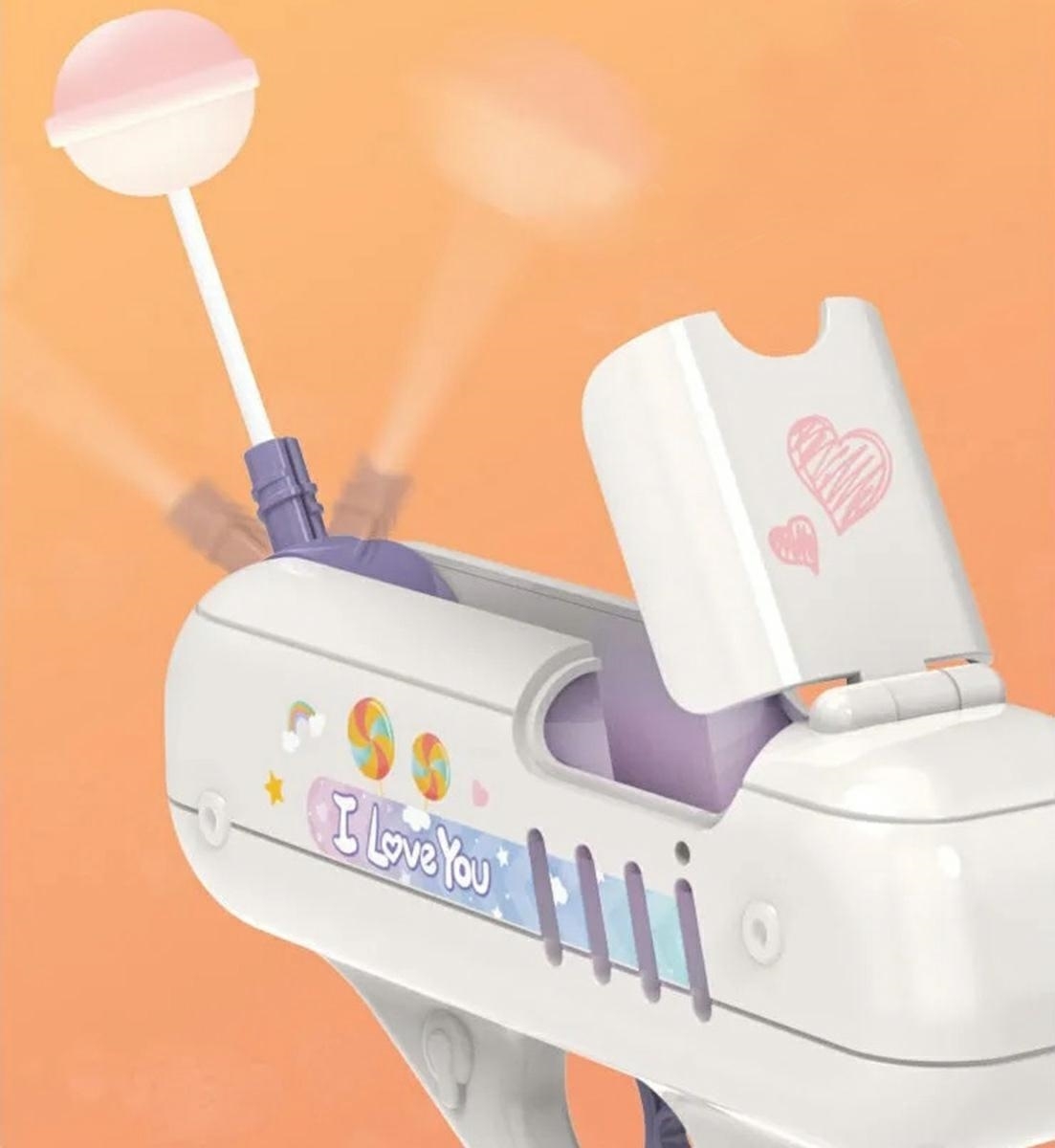 Linksmas žaislas vaikams – lizako šautuvas! Įdėjus saldainį ir paspaudus gaiduką, jis iššoka pro viršutinį dangtelį. Paprasta naudoti, veikia su 3 LR44 baterijomis. Puiki staigmena mažiesiems saldumynų gerbėjams!
