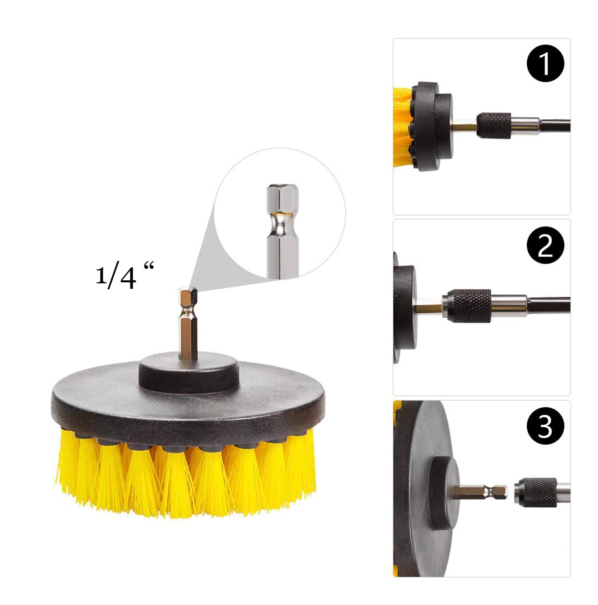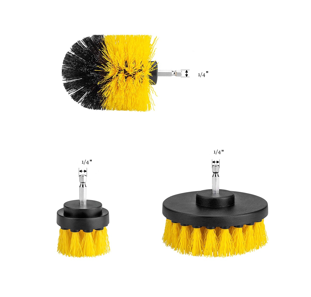 - 3 valymo šepetėlių rinkinys grąžtams ir atsuktuvams su standartiniu 1/4 ” sriegiu.