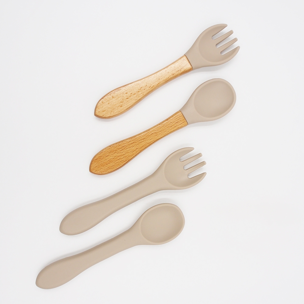 Silikoniniai stalo įrankiai (šakutė, šaukštas) su buko medžio rankenomis.