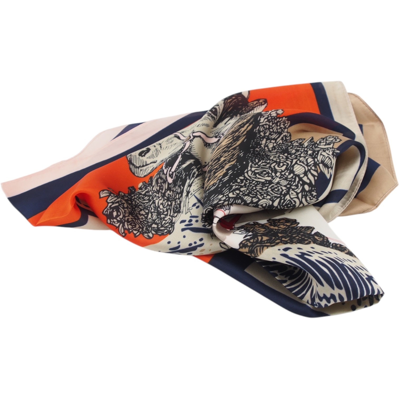 Skarelės dizainas žavi kontrastingais tonais – ryški oranžinė spalva derinama su tamsiai mėlynais, šviesiai rusvais ir kreminiais atspalviais. Kompoziciją puošia meniškai iliustruotas žirgas ir augalų motyvai, kurie suteikia šiai skarelei išskirtinio charakterio bei elegancijos.