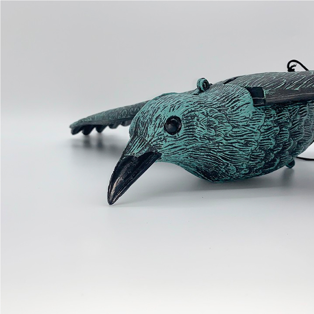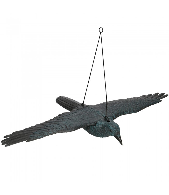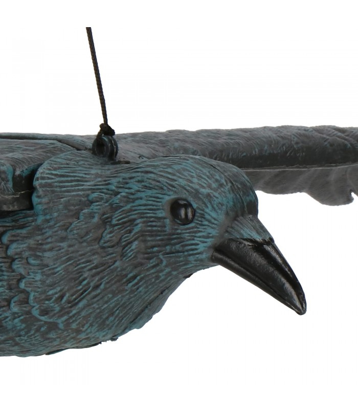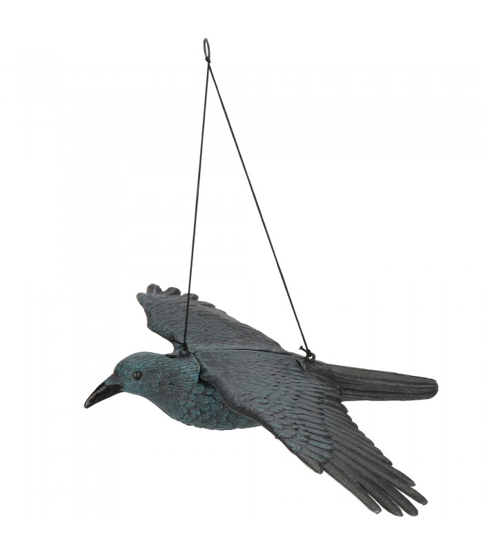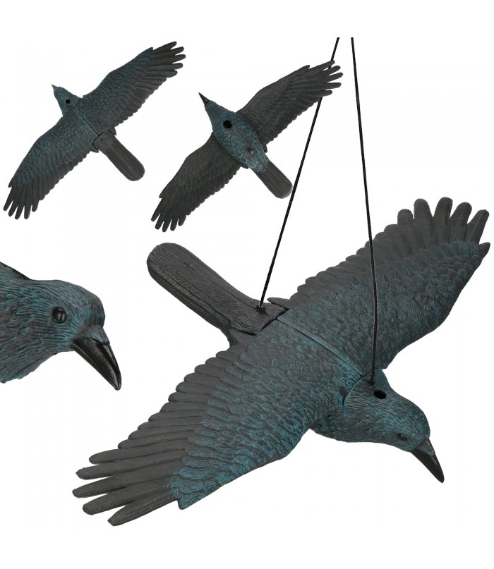 Reali, natūralaus dydžio varna skrydžio metu. Pagaminta iš patvaraus plastiko – itin efektyvus paukščių repelentas. Patogus surinkimo būdas. Atsikratykite erzinančių svečių iš savo sodo ar balkono!