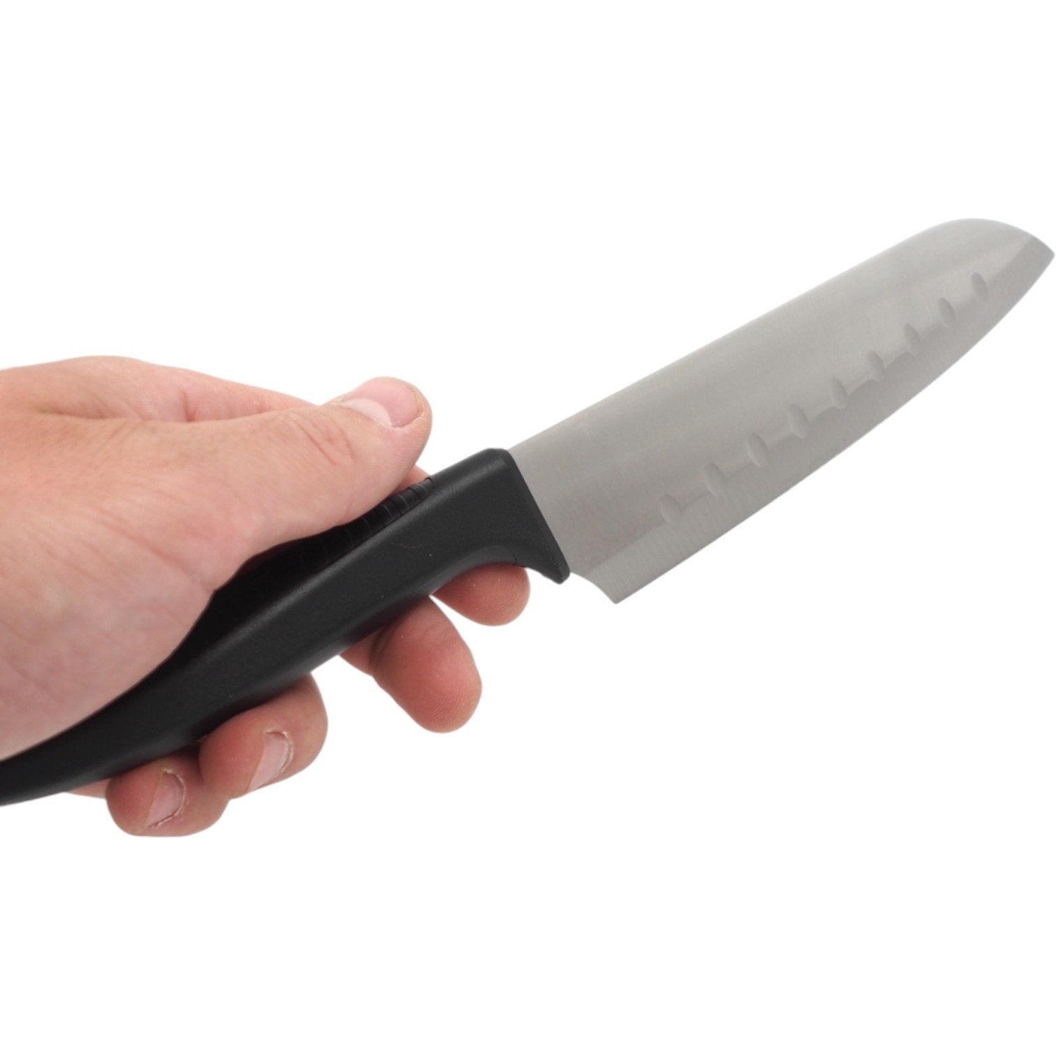 Patogus ir aštrus japoniško stiliaus peilis – nepakeičiamas pagalbininkas kiekvienoje virtuvėje. Pagamintas iš aukštos kokybės nerūdijančio plieno, jis užtikrina ilgaamžiškumą, lengvą priežiūrą ir švarų pjūvį. Specialiai sukurta geležtė su įdubimais sumažina trintį, todėl pjaustant produktai nelimpa prie peilio.