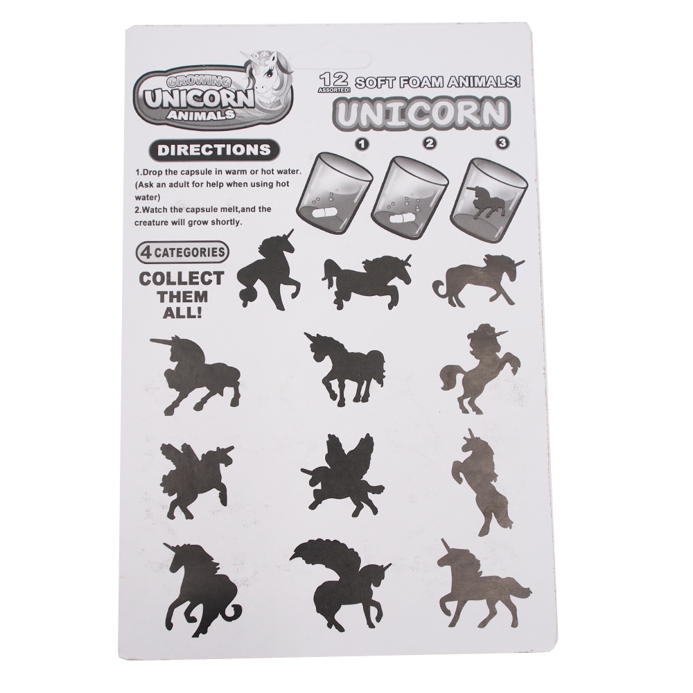 Vandenyje augančios kapsulės vienaragiai TR975B Rinkinyje 12 vnt. kapsulių su vienaragiais. Paruošimas: Įdėkite kapsulę į indą su vandeniu. Galima naudoti šiltą ir šaltą vandenį. Gyvūnas pilnai užaugs per 72 valandas.