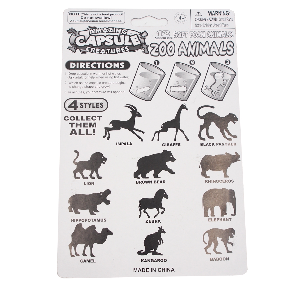 Vandenyje augančios kapsulės zoologijos sodo gyvūnai TR975 Rinkinyje 12 vnt. kapsulių su zoologijos sodo gyvūnais. Paruošimas: Įdėkite kapsulę į indą su vandeniu. Galima naudoti šiltą ir šaltą vandenį. Gyvūnas pilnai užaugs per 72 valandas.